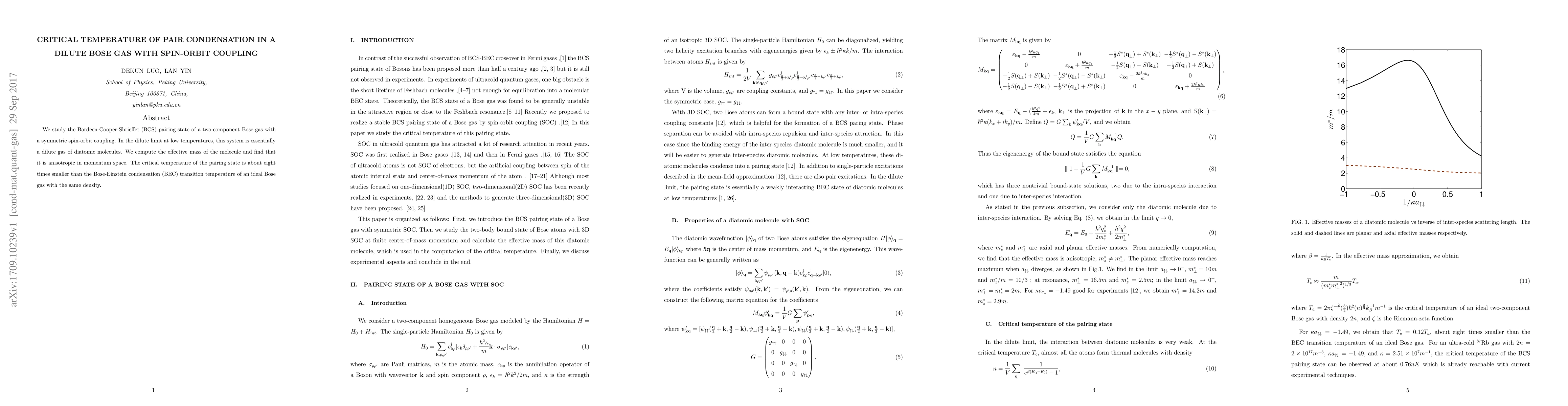 This paper investigates the BCS pairing state in a dilute Bose gas with spin-orbit coupling, finding anisotropic effective mass for the diatomic molecules formed. The critical temperature for this pairing state is approximately eight times lower than the BEC transition temperature for an ideal Bose gas with the same density.