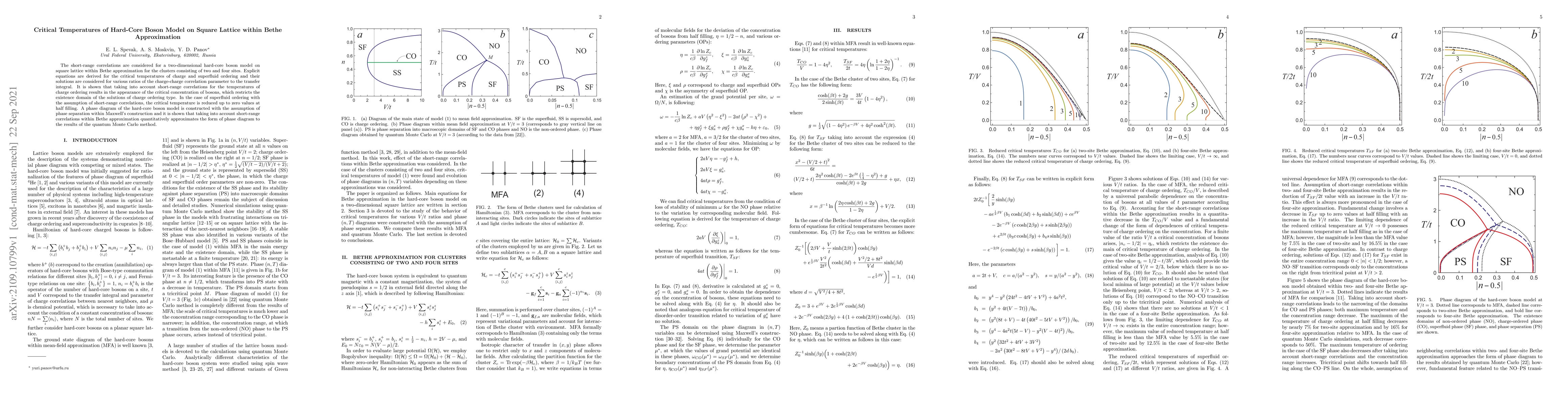 This paper derives critical temperatures for a two-dimensional hard-core boson model on a square lattice using Bethe approximation, showing that short-range correlations lead to a critical concentration for charge ordering and reduce the critical temperature for superfluid ordering, especially at half-filling. The phase diagram aligns with quantum Monte Carlo results.