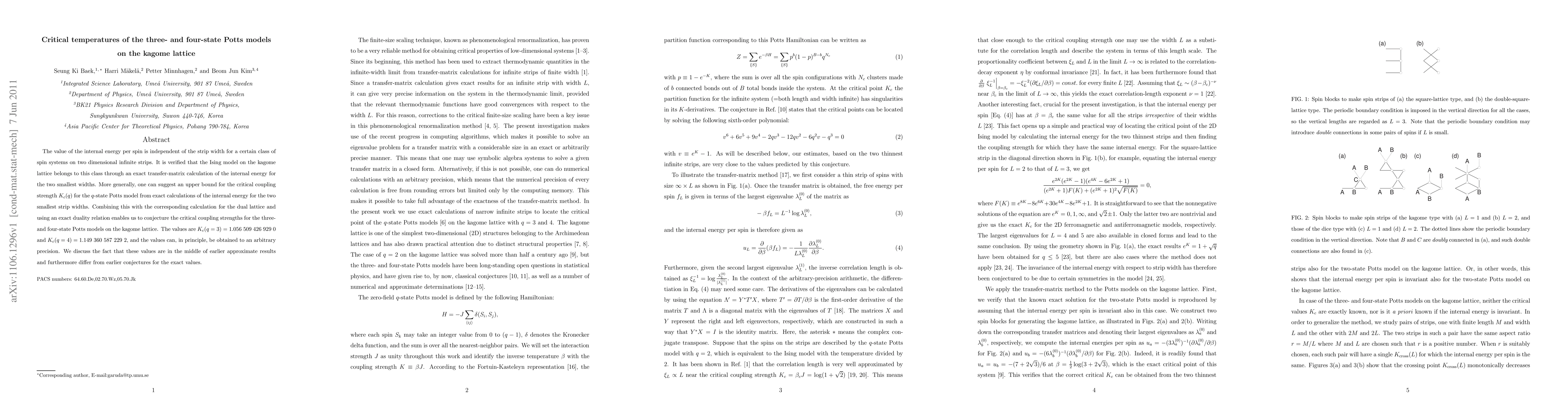 The value of the internal energy per spin is independent of the strip width for a certain class of spin systems on two dimensional infinite strips. It is verified that the Ising model on the kagome lattice belongs to this class through an exact transfer-matrix calculation of the internal energy for the two smallest widths. More generally, one can suggest an upper bound for the critical coupling strength $K_c(q)$ for the $q$-state Potts model from exact calculations of the internal energy for the two smallest strip widths. Combining this with the corresponding calculation for the dual lattice and using an exact duality relation enables us to conjecture the critical coupling strengths for the three- and four-state Potts models on the kagome lattice. The values are $K_c(q=3)=1.056~509~426~929~0$ and $K_c(q=4) = 1.149~360~587~229~2$, and the values can, in principle, be obtained to an arbitrary precision. We discuss the fact that these values are in the middle of earlier approximate results and furthermore differ from earlier conjectures for the exact values.