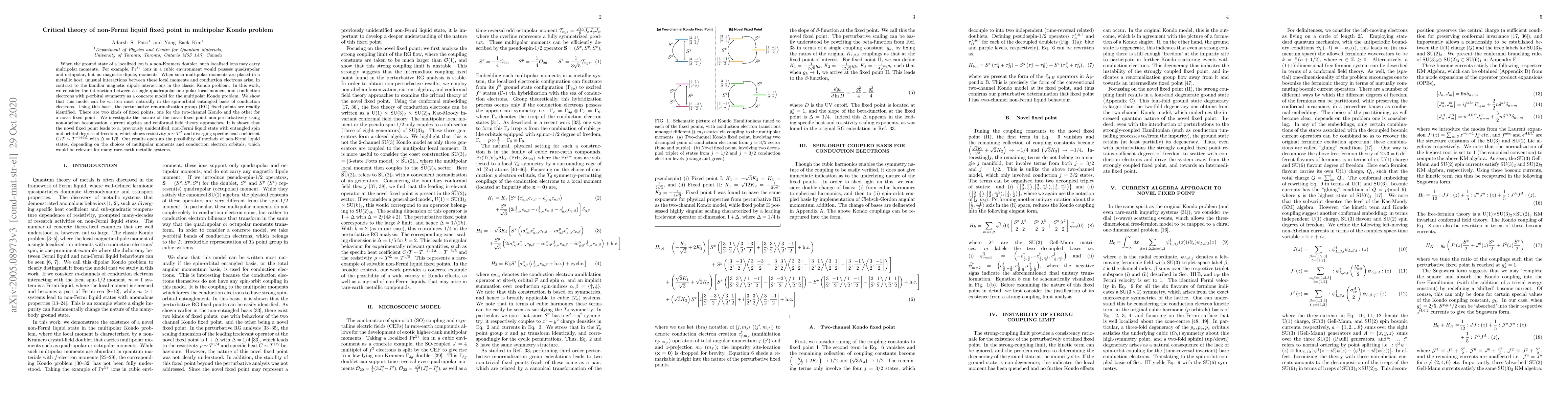 When the ground state of a localized ion is a non-Kramers doublet, such localized ions may carry multipolar moments. For example, Pr$^{3+}$ ions in a cubic environment would possess quadrupolar and octupolar, but no magnetic dipole, moments. When such multipolar moments are placed in a metallic host, unusual interactions between these local moments and conduction electrons arise, in contrast to the familiar magnetic dipole interactions in the classic Kondo problem. In this work, we consider the interaction between a single quadrupolar-octupolar local moment and conduction electrons with $p$-orbital symmetry as a concrete model for the multipolar Kondo problem. We show that this model can be written most naturally in the spin-orbital entangled basis of conduction electrons. Using this basis, the perturbative renormalization group (RG) fixed points are readily identified. There are two kinds of fixed points, one for the two-channel Kondo and the other for a novel fixed point. We investigate the nature of the novel fixed point non-perturbatively using non-abelian bosonization, current algebra and conformal field theory approaches. It is shown that the novel fixed point leads to a, previously unidentified, non-Fermi liquid state with entangled spin and orbital degrees of freedom, which shows resistivity $\rho \sim T^{\Delta}$ and diverging specific heat coefficient $C/T \sim T^{-1 + 2\Delta}$ with $\Delta=1/5$. Our results open up the possibility of myriads of non-Fermi liquid states, depending on the choices of multipolar moments and conduction electron orbitals, which would be relevant for many rare-earth metallic systems.