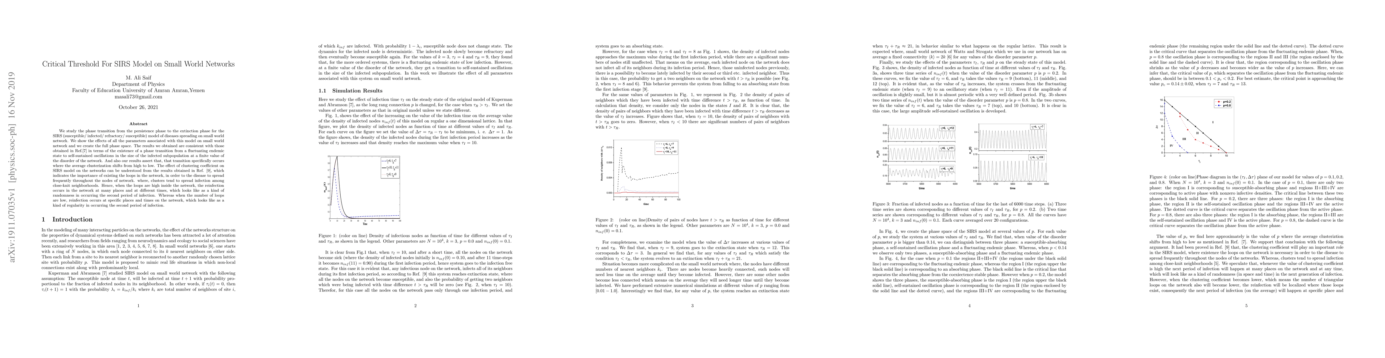 We study the phase transition from the persistence phase to the extinction phase for the SIRS (susceptible/ infected/ refractory/ susceptible) model of diseases spreading on small world network. We show the effects of all the parameters associated with this model on small world network and we create the full phase space. The results we obtained are consistent with those obtained in Ref.[7] in terms of the existence of a phase transition from a fluctuating endemic state to self-sustained oscillations in the size of the infected subpopulation at a finite value of the disorder of the network. And also our results assert that, that transition specifically occurs where the average clusterization shifts from high to low. The effect of clustering coefficient on SIRS model on the networks can be understood from the results obtained in Ref. [9], which indicates the importance of existing the loops in the network, in order to the disease to spread frequently throughout the nodes of network. where, clusters tend to spread infection among close-knit neighborhoods. Hence, when the loops are high inside the network, the reinfection occurs in the network at many places and at different times, which looks like as a kind of randomness in occurring the second period of infection. Whereas when the number of loops are low, reinfection occurs at specific places and times on the network, which looks like as a kind of regularity in occurring the second period of infection.