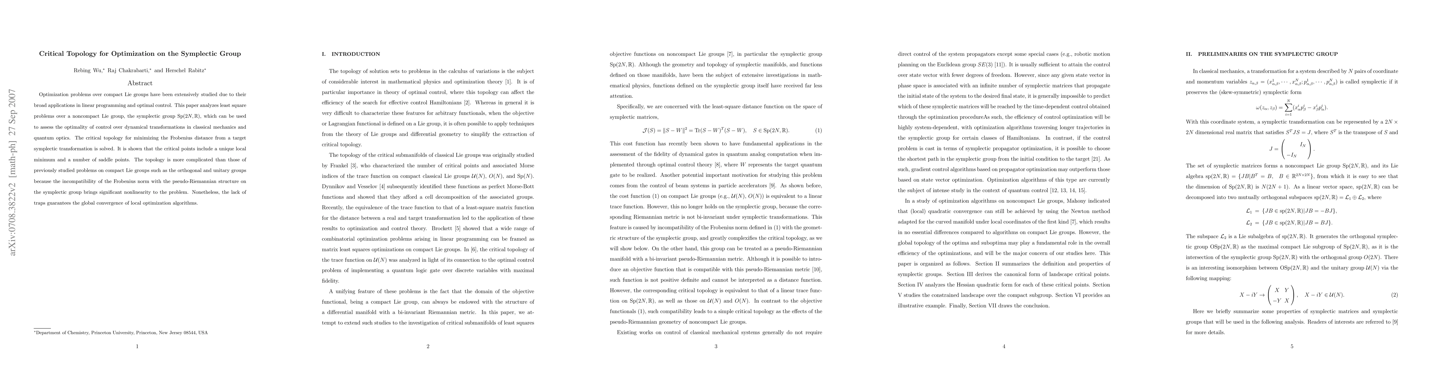 Optimization problems over compact Lie groups have been extensively studied due to their broad applications in linear programming and optimal control. This paper analyzes least square problems over a noncompact Lie group, the symplectic group $\Sp(2N,\R)$, which can be used to assess the optimality of control over dynamical transformations in classical mechanics and quantum optics. The critical topology for minimizing the Frobenius distance from a target symplectic transformation is solved. It is shown that the critical points include a unique local minimum and a number of saddle points. The topology is more complicated than those of previously studied problems on compact Lie groups such as the orthogonal and unitary groups because the incompatibility of the Frobenius norm with the pseudo-Riemannian structure on the symplectic group brings significant nonlinearity to the problem. Nonetheless, the lack of traps guarantees the global convergence of local optimization algorithms.
