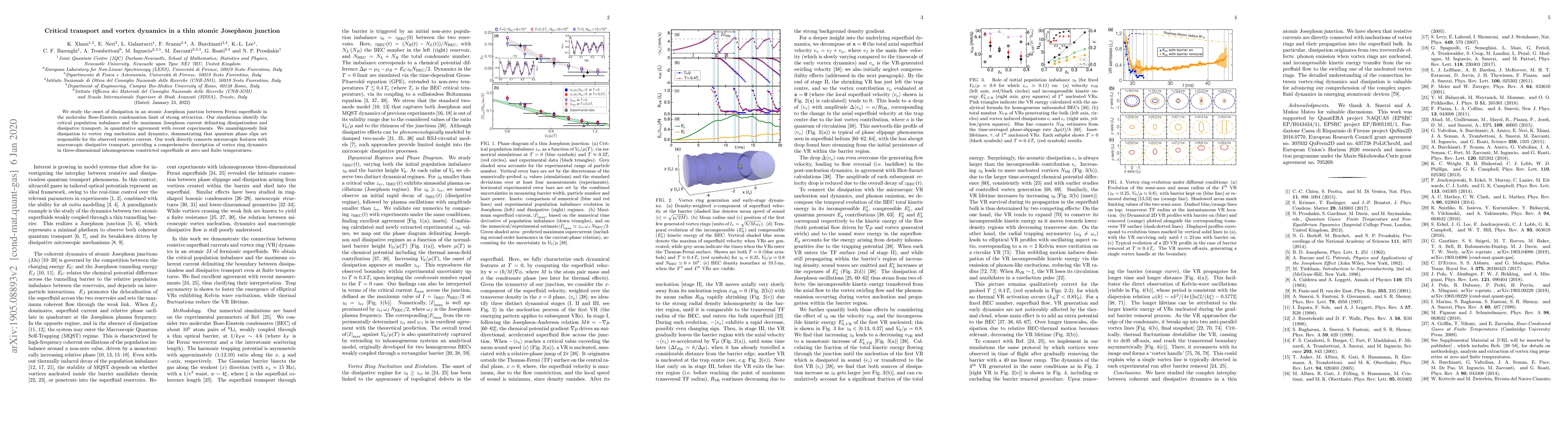 This paper investigates the onset of dissipation in an atomic Josephson junction between Fermi superfluids, identifying critical population imbalance and maximum Josephson current. It links dissipation to vortex ring nucleation and dynamics, attributing resistive current to quantum phase slips, and provides a comprehensive description of vortex ring dynamics in superfluids.