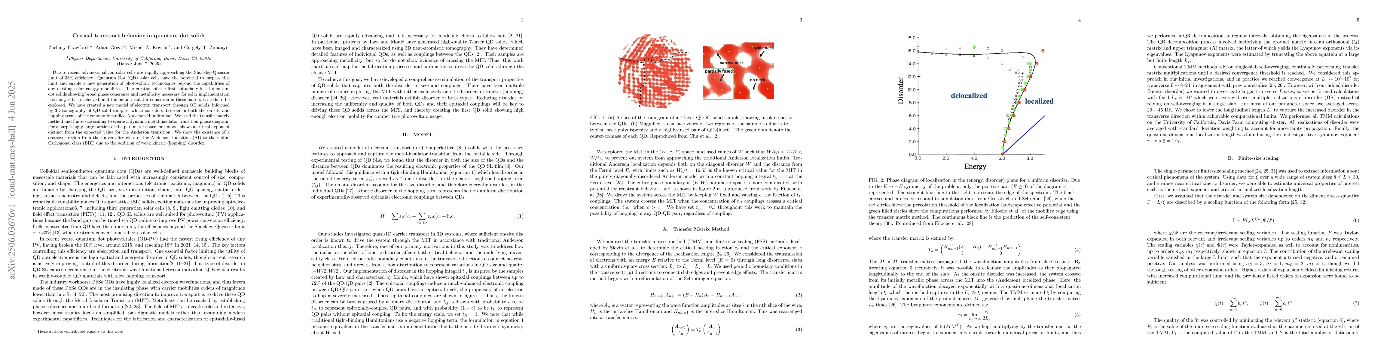 Due to recent advances, silicon solar cells are rapidly approaching the Shockley-Queisser limit of 33% efficiency. Quantum Dot (QD) solar cells have the potential to surpass this limit and enable a new generation of photovoltaic technologies beyond the capabilities of any existing solar energy modalities. The creation of the first epitaxially-fused quantum dot solids showing broad phase coherence and metallicity necessary for solar implementation has not yet been achieved, and the metal-insulator transition in these materials needs to be explored. We have created a new model of electron transport through QD solids, informed by 3D-tomography of QD solid samples, which considers disorder in both the on-site and hopping terms of the commonly studied Anderson Hamiltonian. We used the transfer matrix method and finite-size scaling to create a dynamic metal-insulator transition phase diagram. For a surprisingly large portion of the parameter space, our model shows a critical exponent distinct from the expected value for the Anderson transition. We show the existence of a crossover region from the universality class of the Anderson transition (AI) to the Chiral Orthogonal class (BDI) due to the addition of weak kinetic (hopping) disorder.