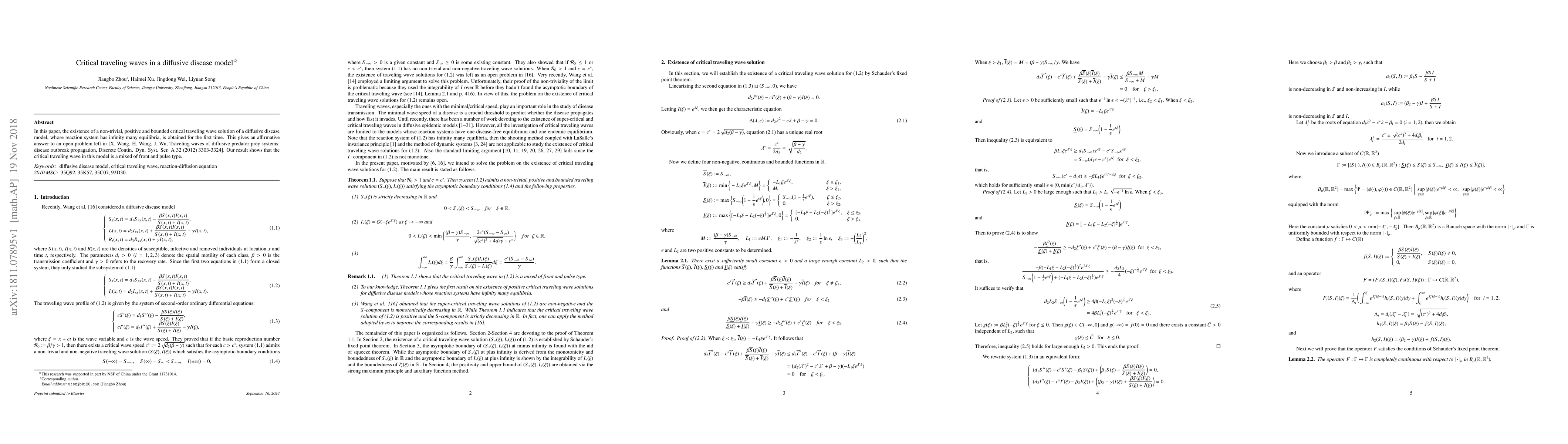 In this paper, the existence of a non-trivial, positive and bounded critical traveling wave solution of a diffusive disease model, whose reaction system has infinity many equilibria, is obtained for the first time. This gives an affirmative answer to an open problem left in [X. Wang, H. Wang, J. Wu, Traveling waves of diffusive predator-prey systems: disease outbreak propagation, Discrete Contin. Dyn. Syst. Ser. A 32 (2012) 3303-3324]. Our result shows that the critical traveling wave in this model is a mixed of front and pulse type.