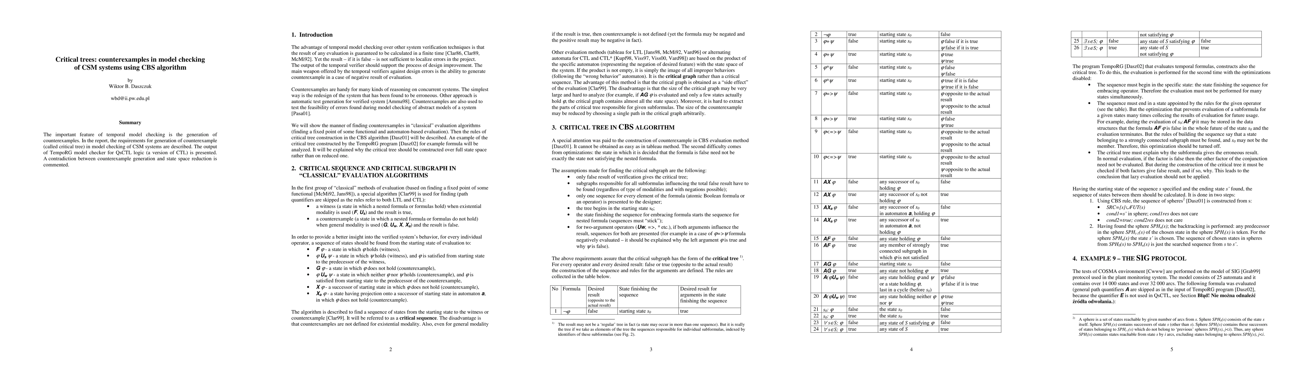 The important feature of temporal model checking is the generation of counterexamples. In the report, the requirements for generation of counterexample (called critical tree) in model checking of CSM systems are described. The output of TempoRG model checker for QsCTL logic (a version of CTL) is presented. A contradiction between counterexample generation and state space reduction is commented.