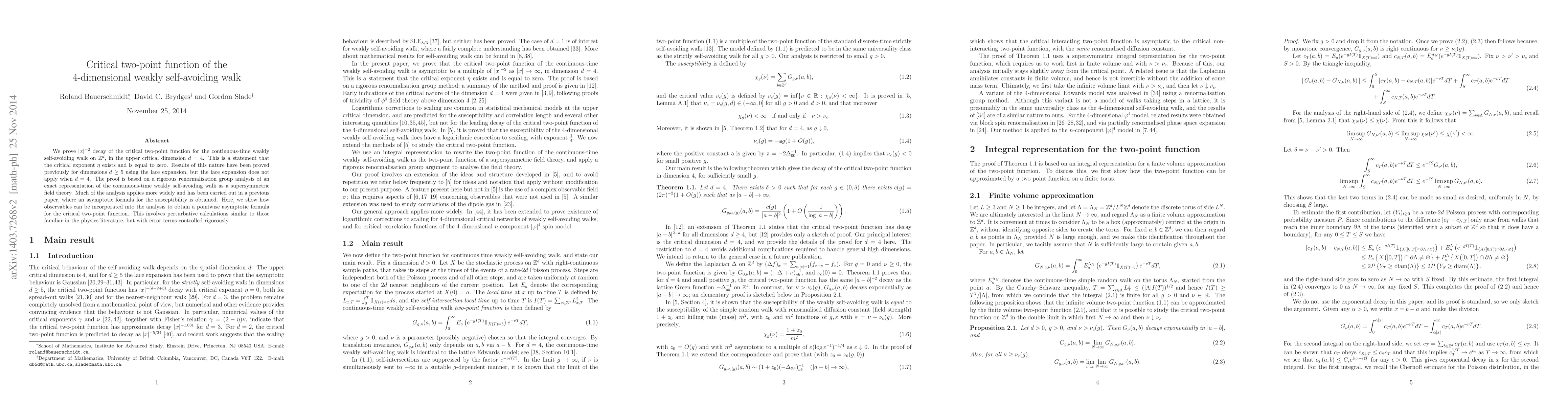 This paper proves the $|x|^{-2}$ decay of the critical two-point function for the 4-dimensional weakly self-avoiding walk, establishing the existence of the critical exponent $\eta = 0$. The proof employs a rigorous renormalisation group analysis and a supersymmetric field theory representation, overcoming the limitations of the lace expansion method.