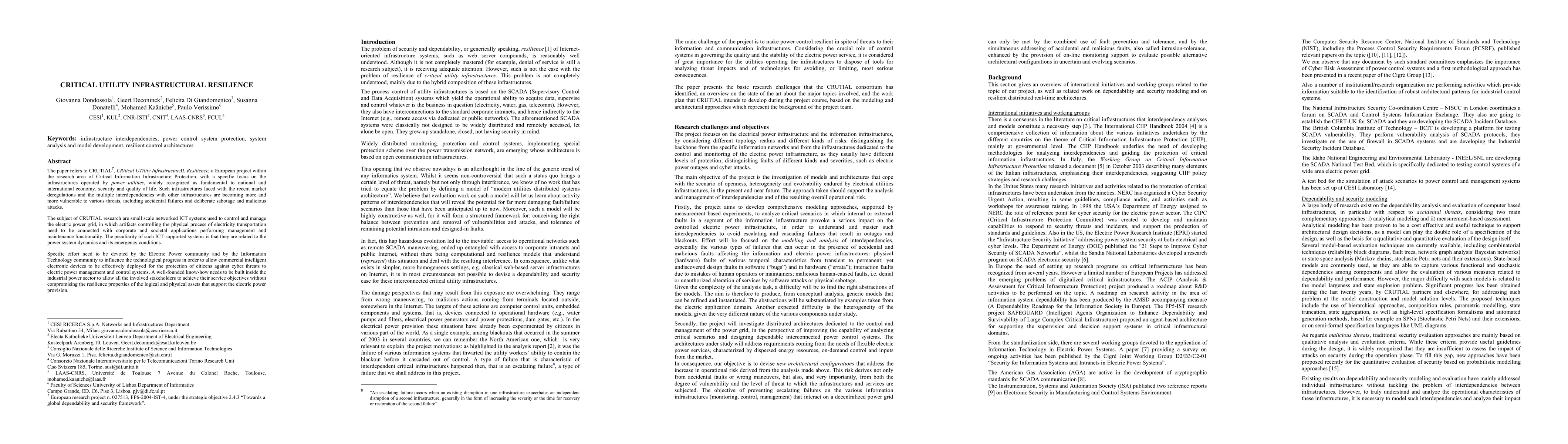 The CRUTIAL project aims to enhance the resilience of critical utility infrastructures, particularly small-scale networked ICT systems managing electric power grids, against cyber threats amidst market deregulations and interdependencies. It emphasizes the need for collaboration between the power and IT sectors to safeguard against attacks while maintaining system resilience.