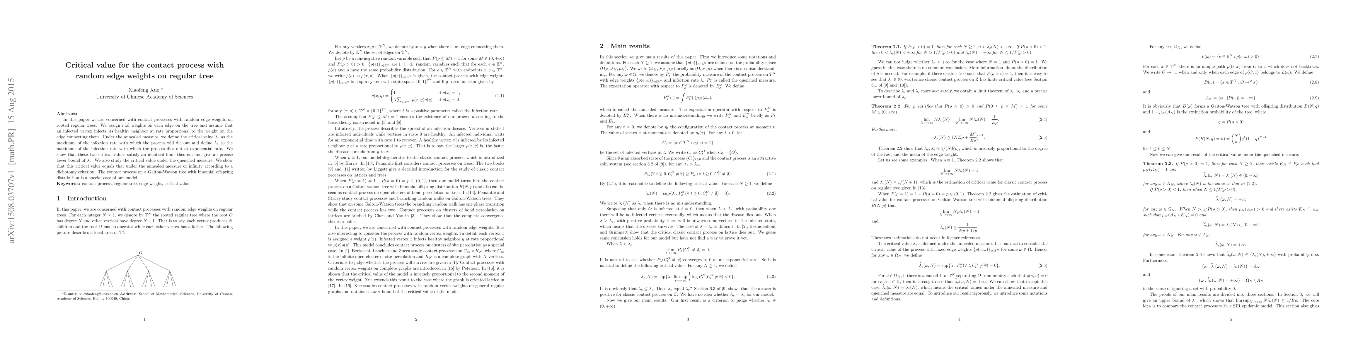 The paper studies contact processes with random edge weights on regular trees, defining critical values \(\lambda_c\) and \(\lambda_e\) under annealed and quenched measures, and proving limit theorems and a lower bound for \(\lambda_e\).
