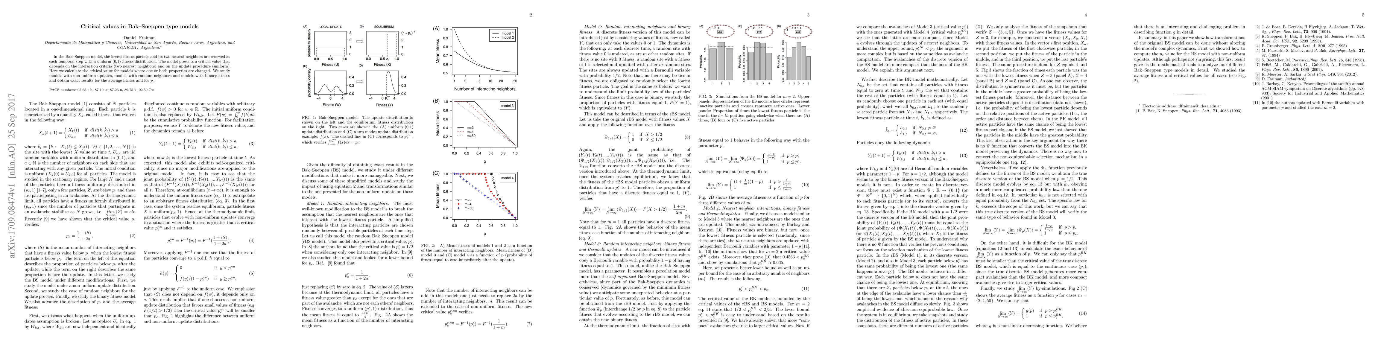 In the Bak-Sneppen model, the lowest fitness particle and its two nearest neighbors are renewed at each temporal step with a uniform (0,1) fitness distribution. The model presents a critical value that depends on the interaction criteria (two nearest neighbors) and on the update procedure (uniform). Here we calculate the critical value for models where one or both properties are changed. We study models with non-uniform updates, models with random neighbors and models with binary fitness and obtain exact results for the average fitness and for $p_c$.