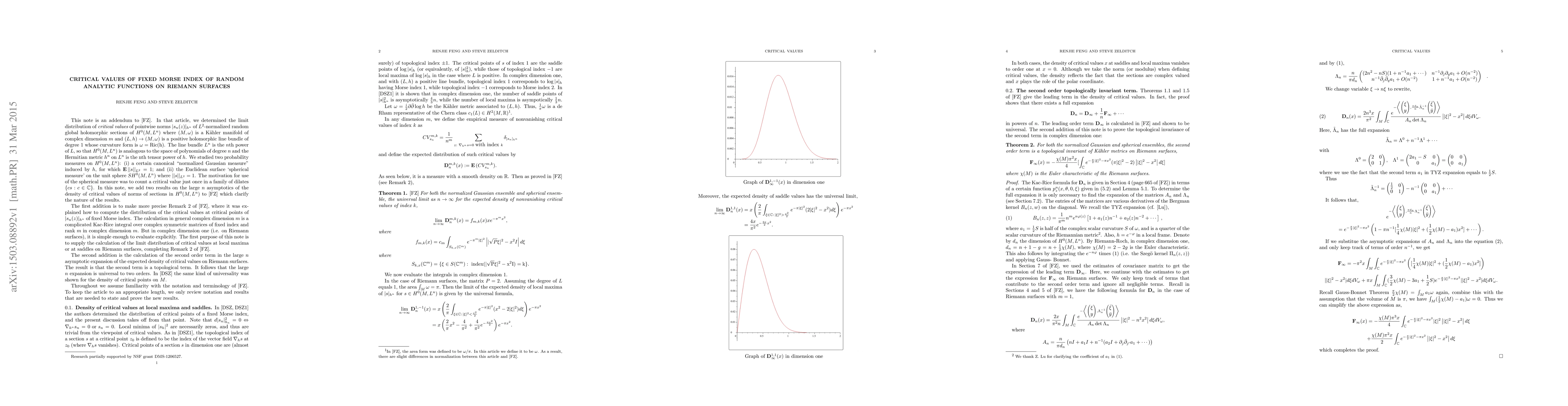 This note is an addendum to 'Critical values of random analytic functions on complex manifolds, Indiana Univ. Math. J. 63 No. 3 (2014), 651-686.' by R.Feng and S. Zelditch (arXiv:1212.4762). In this note, we give the formula of the limiting distribution of the critical values at critical points of random analytic functions of fixed Morse index and we compute explicitly such limitings for local maxima and saddle values in the case of Riemann surfaces; we also prove that the second order term in the full expansion of the distribution of the critical values is topologically invariant on Riemann surfaces.