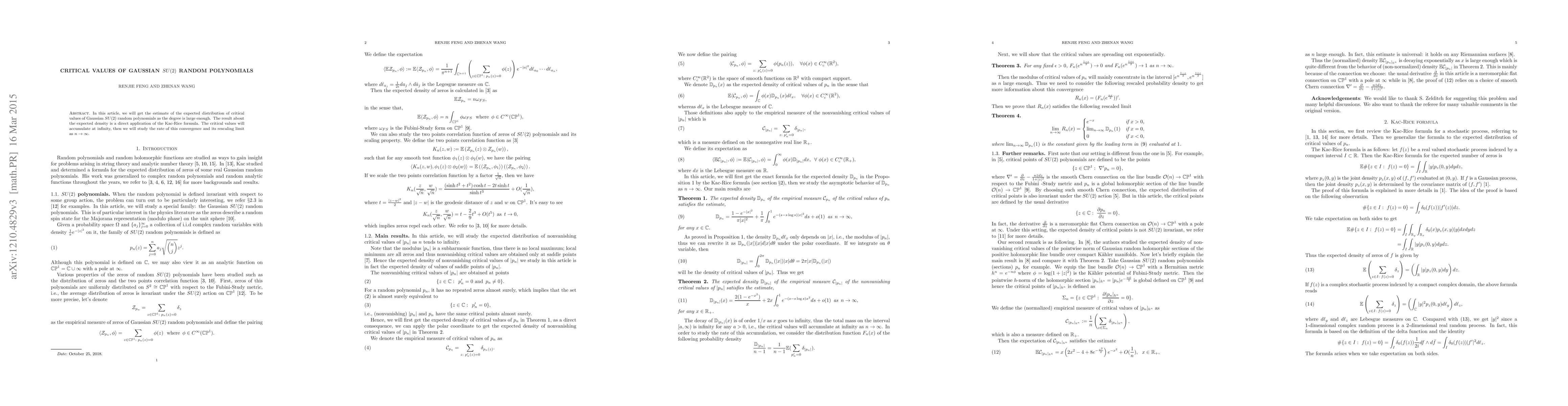 In this note, we will get the estimate of the expected distribution of critical values of Gaussian SU(2) random polynomials as the degree large enough. The result is a direct application of the Kac-Rice formula. The critical values will accumulate at infinity, we further study the rate of this convergence and its rescaling limit as $n\to\infty$.