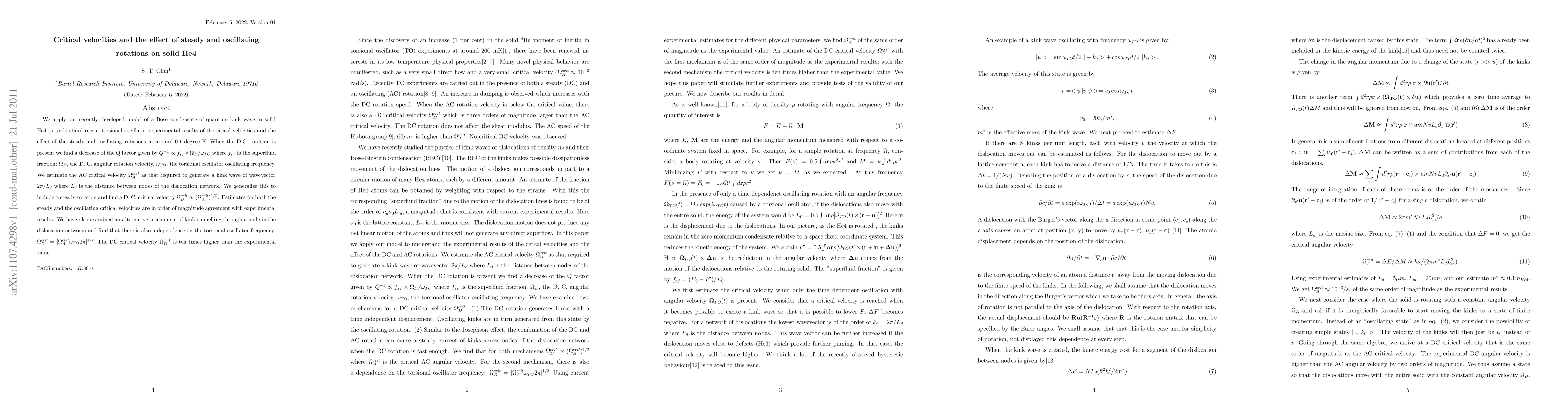 We apply our recently developed model of a Bose condensate of quantum kink wave in solid He4 to understand recent torsional oscillator experimental results of the citical velocities and the effect of the steady and oscillating rotations at around 0.1 degree K. When the D.C. rotation is present we find a decrease of the Q factor given by $Q^{-1} \propto f_{sf}\times \Omega_{D}/\omega_{TO}$ where $f_{sf}$ is the superfluid fraction; $\Omega_{D}$, the D. C. angular rotation velocity, $\omega_{TO}$, the torsional oscillator oscillating frequency. We estimate the AC critical velocity $\Omega_A^{crit}$ as that required to generate a kink wave of wavevector $2\pi/L_d$ where $L_d$ is the distance between nodes of the dislocation network. We generalize this to include a steady rotation and find a D. C. critical velocity $\Omega_D^{crit} \propto (\Omega_{A}^{crit})^{1/2}$. Estimates for both the steady and the oscillating critical velocities are in order of magnitude agreement with experimental results. We have also examined an alternative mechanism of kink tunnelling through a node in the dislocation networm and find that there is also a dependence on the torsional oscillator frequency: $\Omega_D^{crit}=[\Omega_A^{crit} \omega_{TO}2\pi]^{1/2}. $ The DC critical velocity $\Omega_D^{crit}$ is ten times higher than the experimental value.