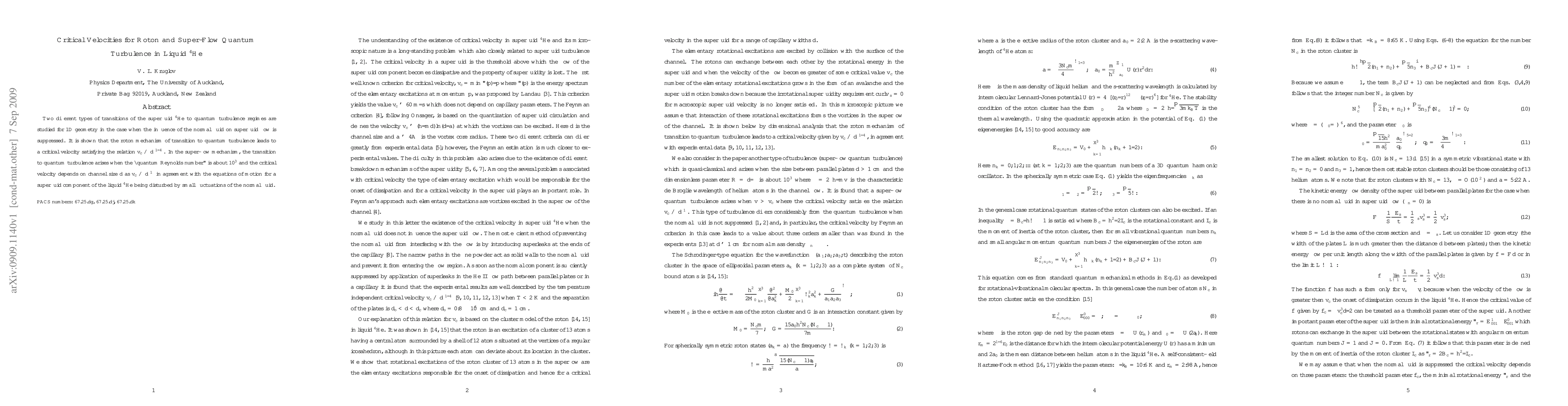 Two different types of transitions of the superfluid $^4$He to quantum turbulence regimes are studied for $1{\rm D}$ geometry in the case when the influence of the normal fluid on superfluid flow is suppressed. It is shown that the roton mechanism of transition to quantum turbulence leads to a critical velocity satisfying the relation $v_c\propto d^{-1/4}$. In the super-flow mechanism, the transition to quantum turbulence arises when the "quantum Reynolds number" is about $10^3$ and the critical velocity depends on channel size $d$ as $v_c\propto d^{-1}$ in agreement with the equations of motion for a superfluid component of the liquid $^4$He being disturbed by small fluctuations of the normal fluid.