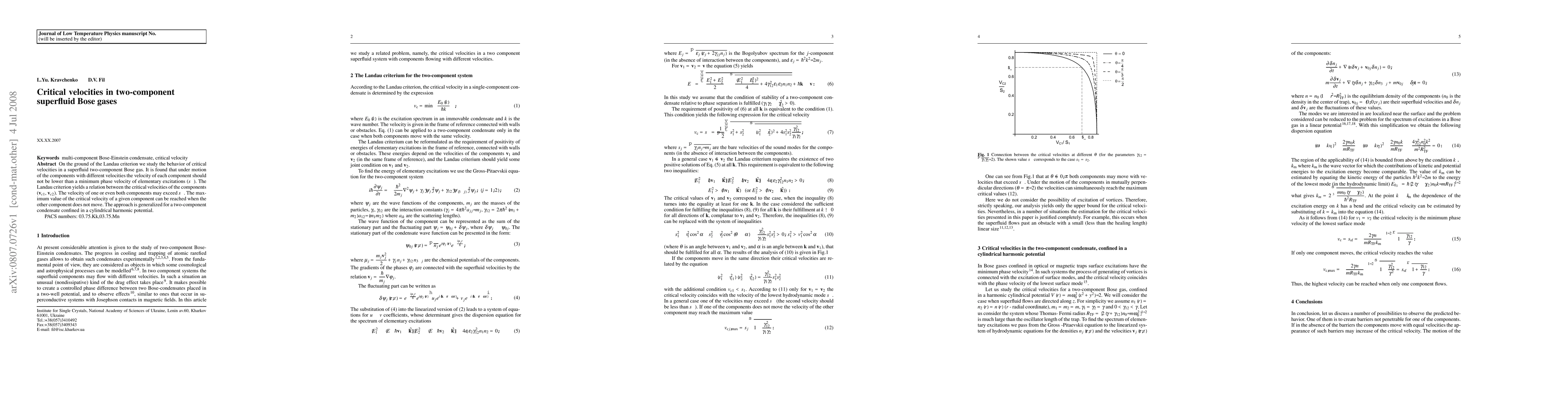 This paper explores critical velocities in superfluid two-component Bose gases using the Landau criterion, finding that each component must exceed a minimum phase velocity of excitations to avoid dissipation. The study generalizes this approach for a cylindrical harmonic potential, revealing the relationship between the critical velocities of the two components.