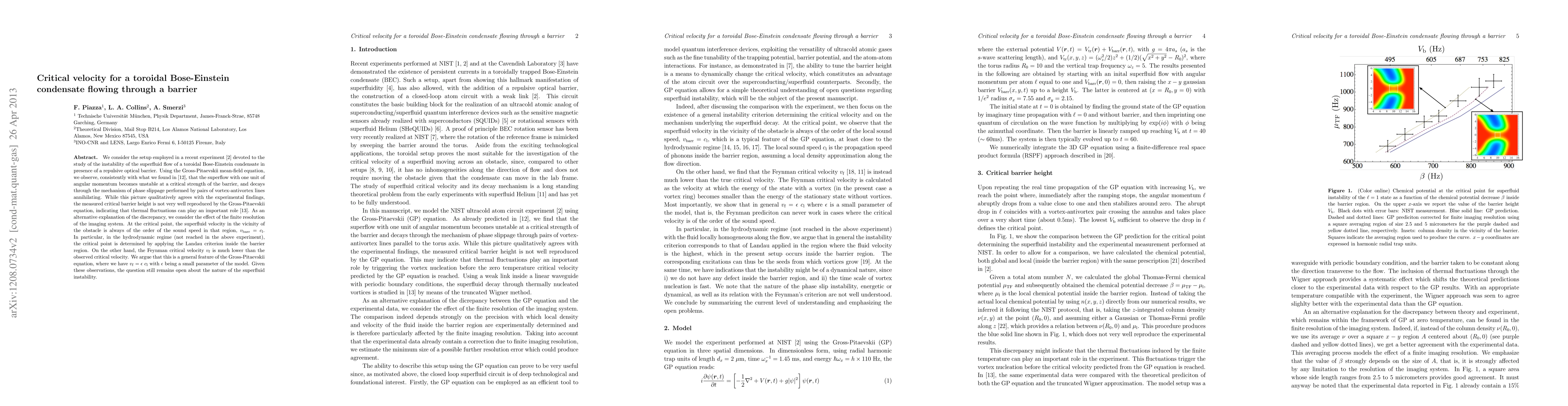 We consider the setup employed in a recent experiment (Ramanathan et al 2011 Phys. Rev. Lett. 106 130401) devoted to the study of the instability of the superfluid flow of a toroidal Bose-Einstein condensate in presence of a repulsive optical barrier. Using the Gross-Pitaevskii mean-field equation, we observe, consistently with what we found in Piazza et al (2009 Phys. Rev. A 80 021601), that the superflow with one unit of angular momentum becomes unstable at a critical strength of the barrier, and decays through the mechanism of phase slippage performed by pairs of vortex-antivortex lines annihilating. While this picture qualitatively agrees with the experimental findings, the measured critical barrier height is not very well reproduced by the Gross-Pitaevskii equation, indicating that thermal fluctuations can play an important role (Mathey et al 2012 arXiv:1207.0501). As an alternative explanation of the discrepancy, we consider the effect of the finite resolution of the imaging system. At the critical point, the superfluid velocity in the vicinity of the obstacle is always of the order of the sound speed in that region, $v_{\rm barr}=c_{\rm l}$. In particular, in the hydrodynamic regime (not reached in the above experiment), the critical point is determined by applying the Landau criterion inside the barrier region. On the other hand, the Feynman critical velocity $v_{\rm f}$ is much lower than the observed critical velocity. We argue that this is a general feature of the Gross-Pitaevskii equation, where we have $v_{\rm f}=\epsilon\ c_{\rm l}$ with $\epsilon$ being a small parameter of the model. Given these observations, the question still remains open about the nature of the superfluid instability.