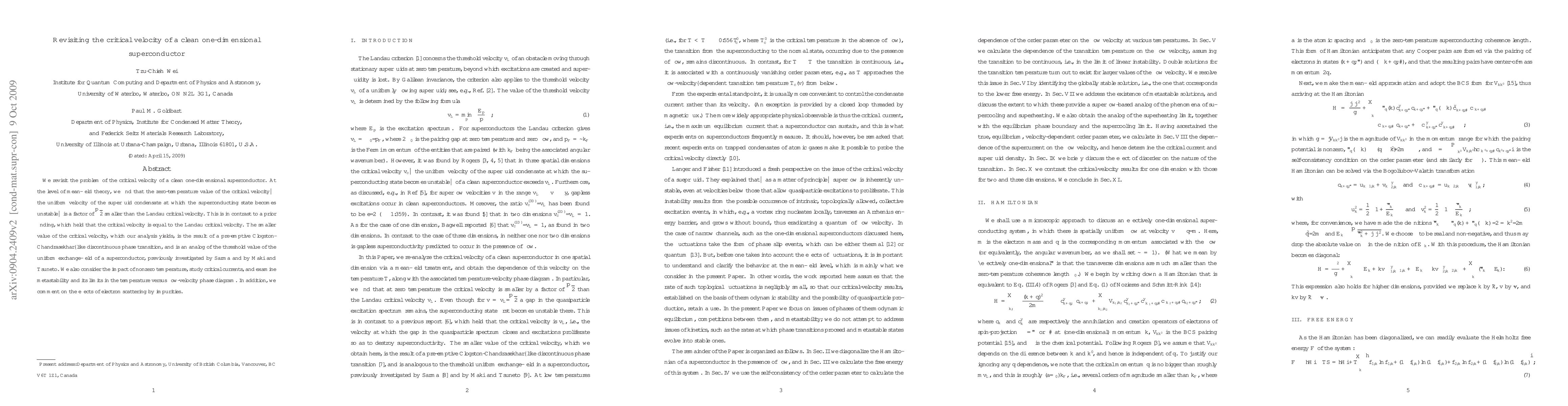 We revisit the problem of the critical velocity of a clean one-dimensional superconductor. {\changed At the level of mean-field theory}, we find that the zero-temperature value of the critical velocity--the uniform velocity of the superfluid condensate at which the superconducting state becomes unstable--is a factor of $\sqrt{2}$ smaller than the Landau critical velocity. This is in contrast to a prior finding, which held that the critical velocity is equal to the Landau critical velocity. The smaller value of the critical velocity, which our analysis yields, is the result of a pre-emptive Clogston-Chandrasekhar--like discontinuous phase transition, and is an analog of the threshold value of the uniform exchange-field of a superconductor, previously investigated by Sarma and by Maki and Tsuneto. We also consider the impact of nonzero temperature, study critical currents, and examine metastability and its limits in the temperature versus flow-velocity phase diagram. In addition, we comment on the effects of electron scattering by impurities.