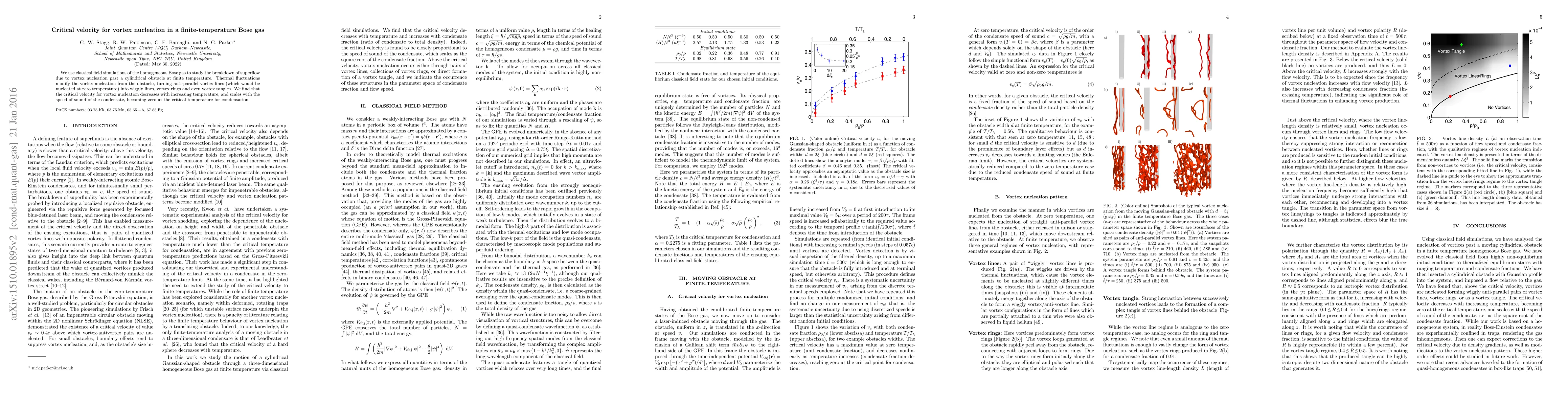 This study uses classical field simulations to investigate vortex nucleation in a finite-temperature Bose gas around a cylindrical obstacle, revealing that thermal fluctuations transform anti-parallel vortex lines into complex structures. The critical velocity for vortex formation decreases with temperature and vanishes at the critical condensation temperature.