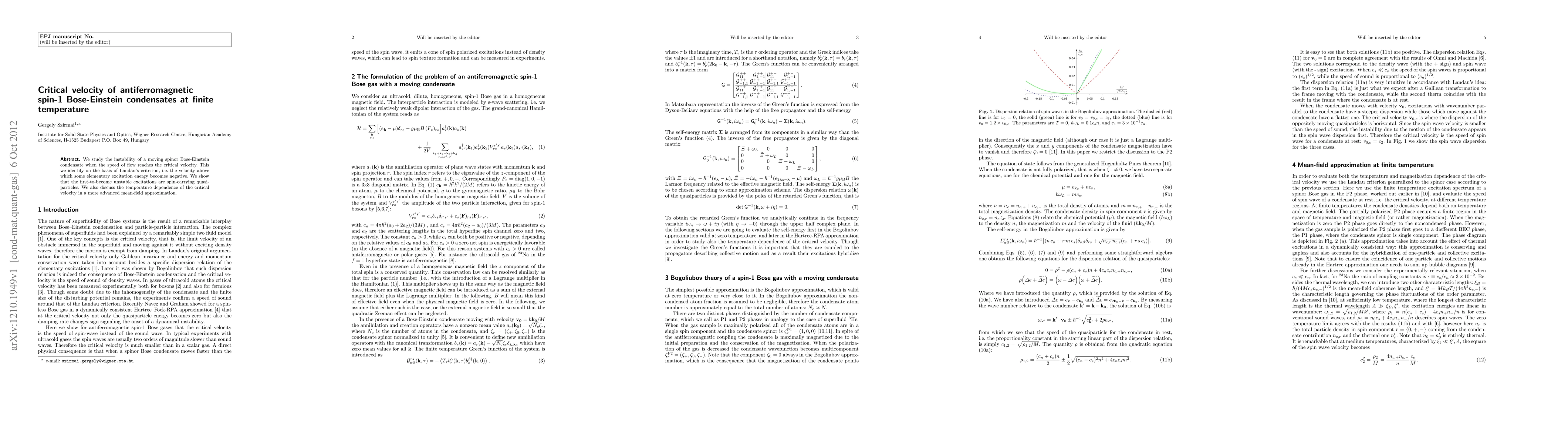 This paper investigates the critical velocity at which a moving spin-1 Bose-Einstein condensate becomes unstable, identifying it using Landau's criterion. It finds that spin-carrying quasiparticles are the first to become unstable and examines the temperature dependence of this critical velocity in a more advanced mean-field approximation.