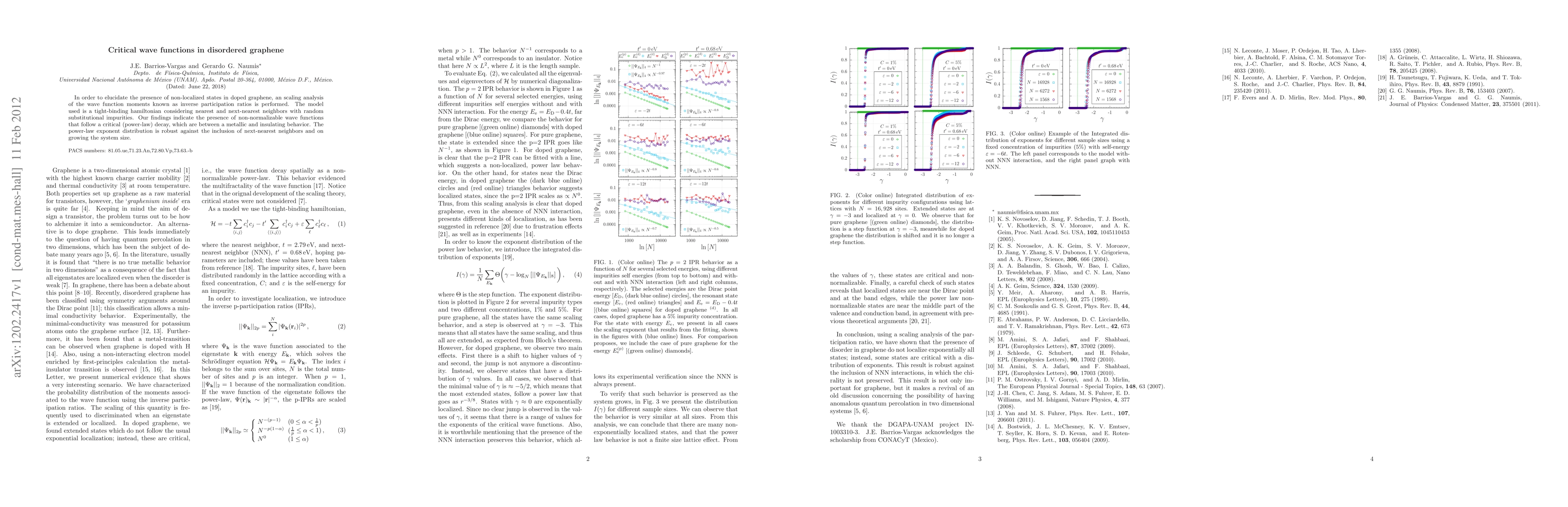 In order to elucidate the presence of non-localized states in doped graphene, an scaling analysis of the wave function moments known as inverse participation ratios is performed. The model used is a tight- binding hamiltonian considering nearest and next-nearest neighbors with random substitutional impurities. Our findings indicate the presence of non-normalizable wave functions that follow a critical (power-law) decay, which are between a metallic and insulating behavior. The power-law exponent distribution is robust against the inclusion of next-nearest neighbors and on growing the system size.