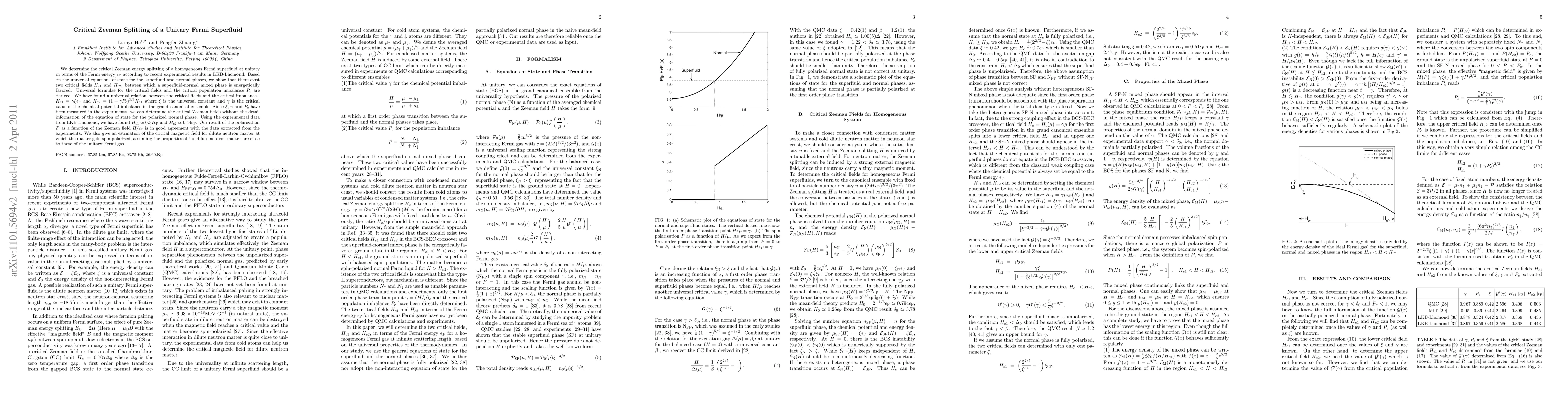Researchers found two critical Zeeman energy splitting fields for a unitary Fermi superfluid, with a universal relation between the fields and population imbalance, allowing for precise calculations without knowing the equation of state for the polarized normal phase.