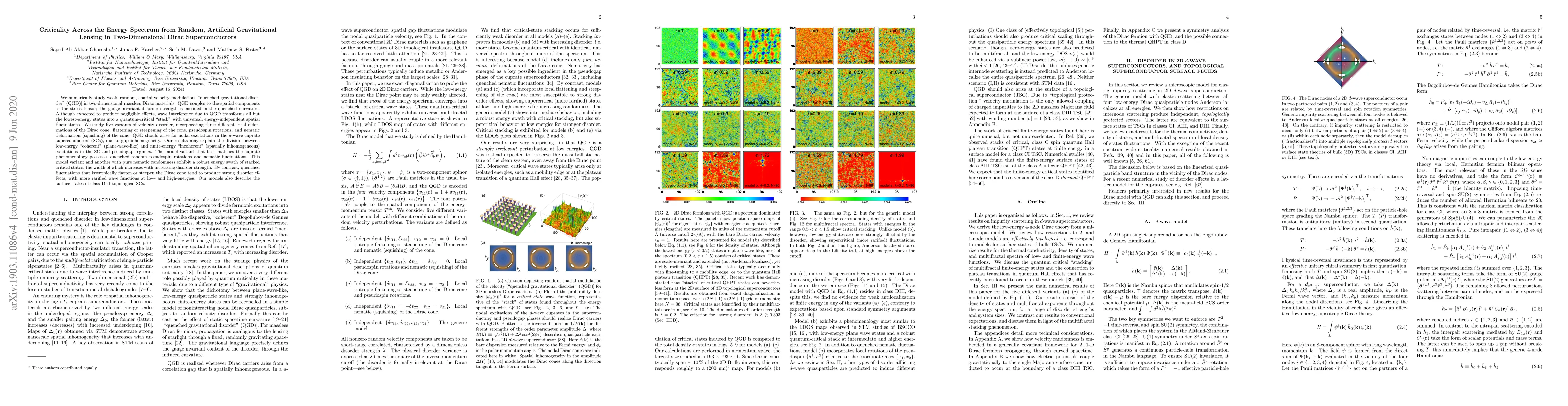 We numerically study weak, random, spatial velocity modulation ["quenched gravitational disorder" (QGD)] in two-dimensional massless Dirac materials. QGD couples to the spatial components of the stress tensor; the gauge-invariant disorder strength is encoded in the quenched curvature. Although expected to produce negligible effects, wave interference due to QGD transforms all but the lowest-energy states into a quantum-critical "stack" with universal, energy-independent spatial fluctuations. We study five variants of velocity disorder, incorporating three different local deformations of the Dirac cone: flattening or steepening of the cone, pseudospin rotations, and nematic deformation (squishing) of the cone. QGD should arise for nodal excitations in the $d$-wave cuprate superconductors (SCs), due to gap inhomogeneity. Our results may explain the division between low-energy "coherent" (plane-wave-like) and finite-energy "incoherent" (spatially inhomogeneous) excitations in the SC and pseudogap regimes. The model variant that best matches the cuprate phenomenology possesses quenched random pseudospin rotations and nematic fluctuations. This model variant and another with pure nematic randomness exhibit a robust energy swath of stacked critical states, the width of which increases with increasing disorder strength. By contrast, quenched fluctuations that isotropically flatten or steepen the Dirac cone tend to produce strong disorder effects, with more rarified wave functions at low- and high-energies. Our models also describe the surface states of class DIII topological SCs.