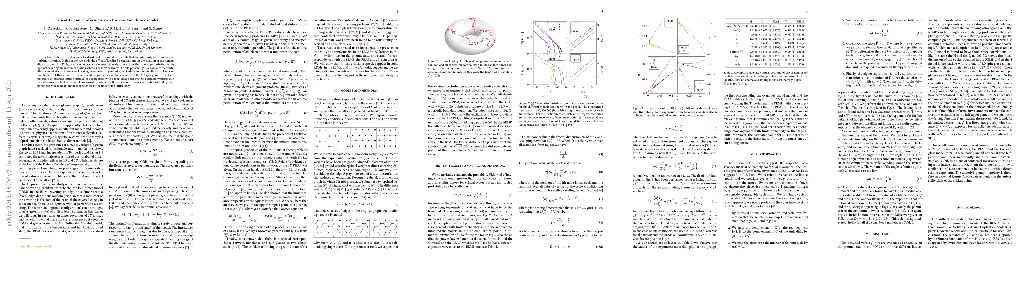 In critical systems, the effect of a localized perturbation affects points that are arbitrarily far from the perturbation location. In this paper, we study the effect of localized perturbations on the solution of the random dimer problem in $2D$. By means of an accurate numerical analysis, we show that a local perturbation of the optimal covering induces an excitation whose size is extensive with finite probability. We compute the fractal dimension of the excitations and scaling exponents. In particular, excitations in random dimer problems on non-bipartite lattices have the same statistical properties of domain walls in the $2D$ spin glass. Excitations produced in bipartite lattices, instead, are compatible with a loop-erased self-avoiding random walk process. In both cases, we find evidence of conformal invariance of the excitations that is compatible with $\mathrm{SLE}_\kappa$ with parameter $\kappa$ depending on the bipartiteness of the underlying lattice only.