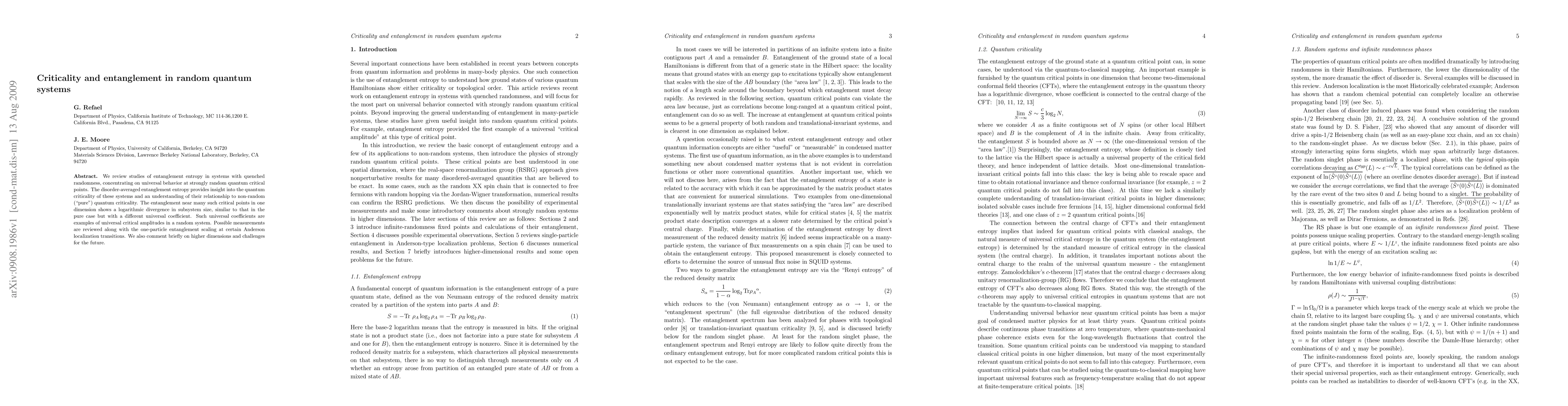 This paper reviews entanglement entropy in quantum systems with quenched randomness, focusing on universal behaviors at strongly random quantum critical points. It highlights the logarithmic divergence of entanglement entropy in one-dimensional systems, contrasting it with pure quantum criticality and discussing potential measurement techniques and future challenges.