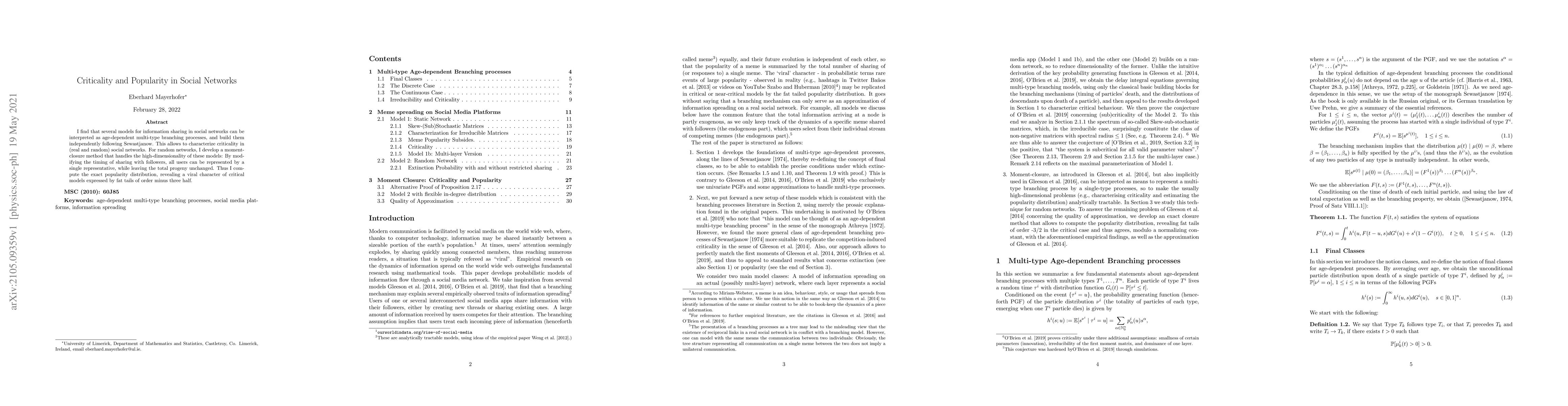 I find that several models for information sharing in social networks can be interpreted as age-dependent multi-type branching processes, and build them independently following Sewastjanow. This allows to characterize criticality in (real and random) social networks. For random networks, I develop a moment-closure method that handles the high-dimensionality of these models: By modifying the timing of sharing with followers, all users can be represented by a single representative, while leaving the total progeny unchanged. Thus I compute the exact popularity distribution, revealing a viral character of critical models expressed by fat tails of order minus three half.