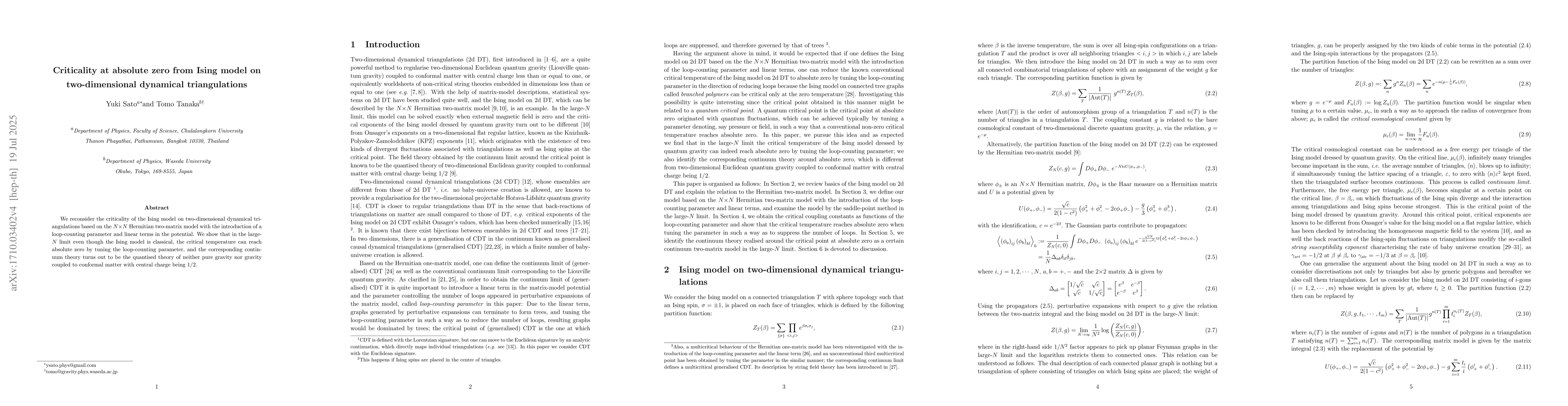 This paper demonstrates that the Ising model on two-dimensional dynamical triangulations can reach criticality at absolute zero by adjusting a loop-counting parameter, despite being classically defined. The continuum theory derived does not correspond to pure gravity or gravity coupled to conformal matter with a central charge of 1/2.