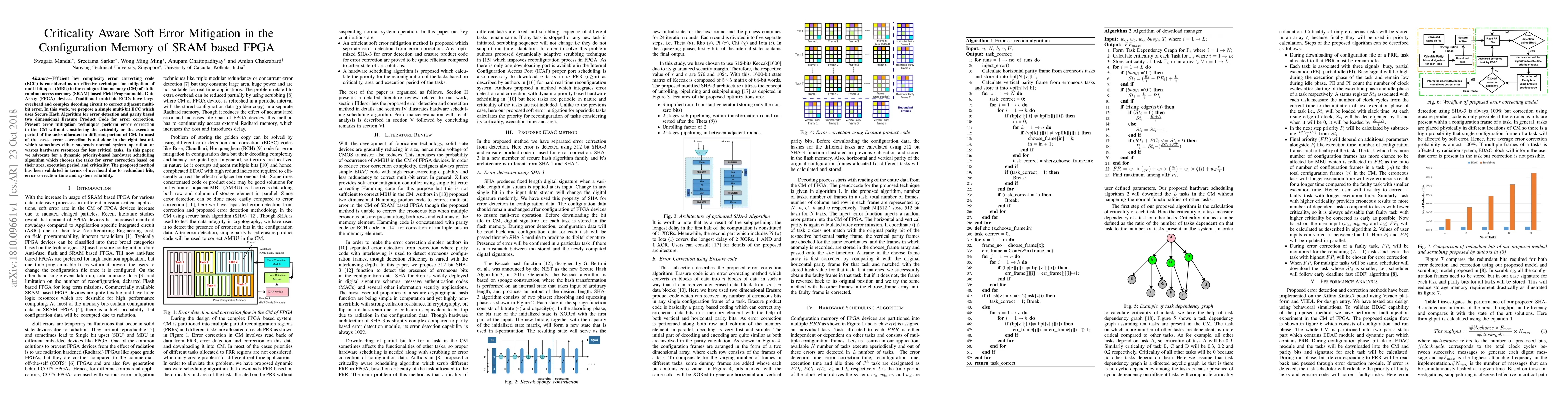 Efficient low complexity error correcting code(ECC) is considered as an effective technique for mitigation of multi-bit upset (MBU) in the configuration memory(CM)of static random access memory (SRAM) based Field Programmable Gate Array (FPGA) devices. Traditional multi-bit ECCs have large overhead and complex decoding circuit to correct adjacent multibit error. In this work, we propose a simple multi-bit ECC which uses Secure Hash Algorithm for error detection and parity based two dimensional Erasure Product Code for error correction. Present error mitigation techniques perform error correction in the CM without considering the criticality or the execution period of the tasks allocated in different portion of CM. In most of the cases, error correction is not done in the right instant, which sometimes either suspends normal system operation or wastes hardware resources for less critical tasks. In this paper,we advocate for a dynamic priority-based hardware scheduling algorithm which chooses the tasks for error correction based on their area, execution period and criticality. The proposed method has been validated in terms of overhead due to redundant bits, error correction time and system reliability