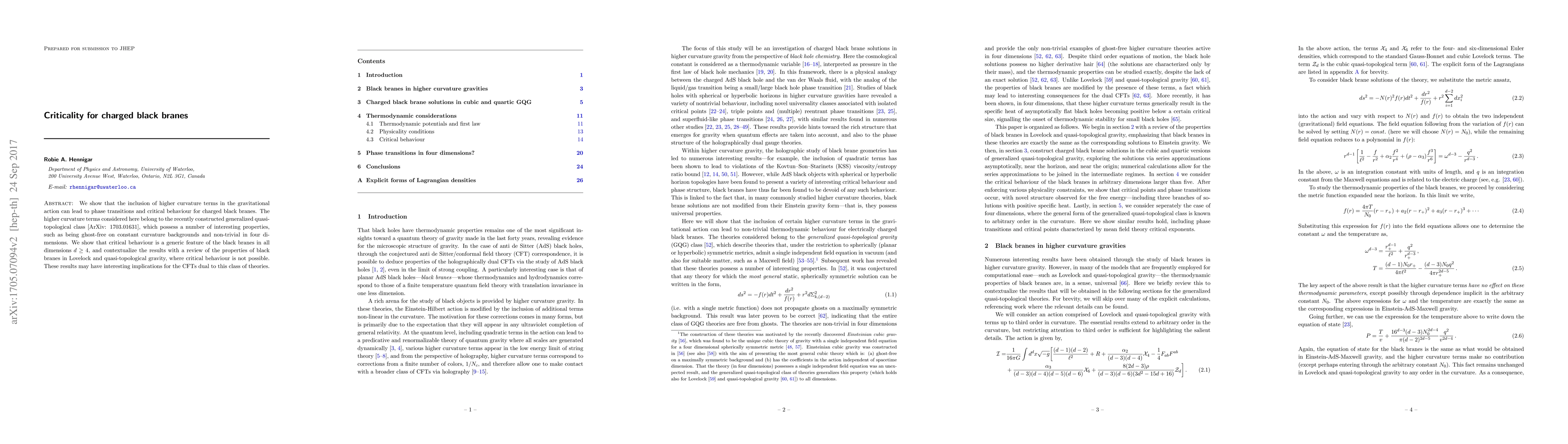 This paper demonstrates that incorporating higher curvature terms in the gravitational action results in phase transitions and critical behavior for charged black branes, particularly in the generalized quasi-topological gravity class. Critical behavior is shown to be a generic feature for black branes in dimensions $d \ge 4$, with implications for dual conformal field theories.