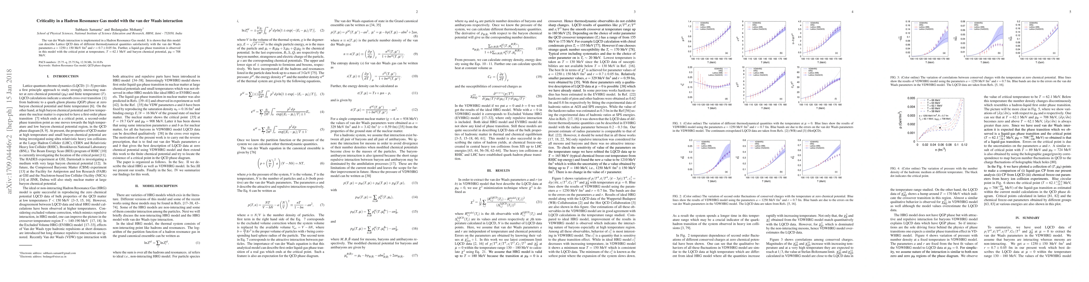 This paper introduces a Hadron Resonance Gas model incorporating van der Waals interactions, successfully fitting Lattice QCD data with parameters $a = 1250 \pm 150$ MeV fm$^3$ and $r = 0.7 \pm 0.05$ fm. It identifies a phase transition with a critical point at $T = 62.1$ MeV and $\mu_B = 708$ MeV.