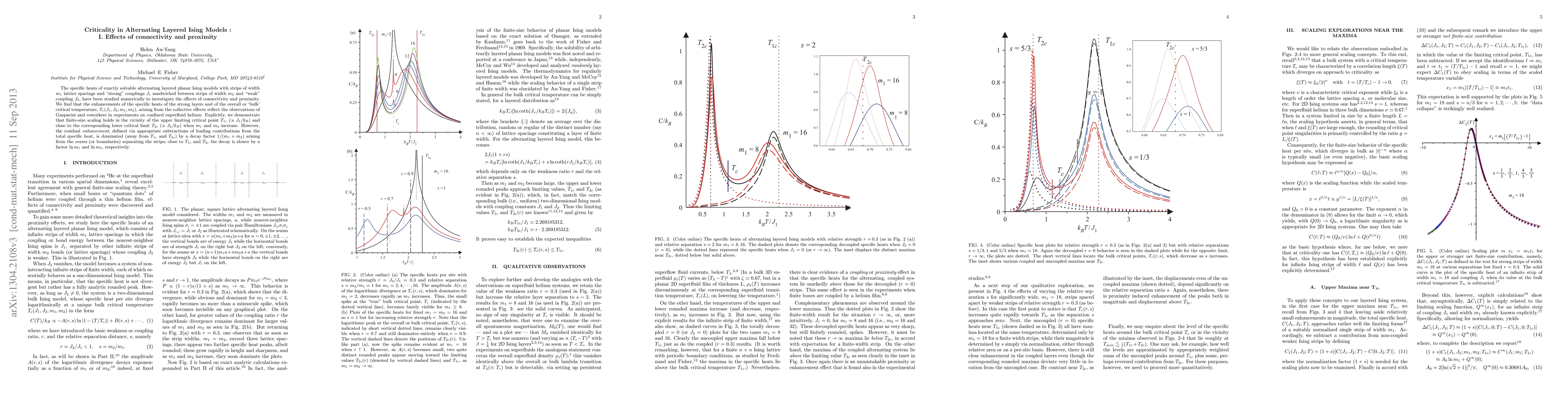 The specific heats of exactly solvable alternating layered planar Ising models with strips of width $m_1$ lattice spacings and ``strong'' couplings $J_1$ sandwiched between strips of width $m_2$ and ``weak'' coupling $J_2$, have been studied numerically to investigate the effects of connectivity and proximity. We find that the enhancements of the specific heats of the strong layers and of the overall or `bulk' critical temperature, $T_c(J_1,J_2;m_1,m_2)$, arising from the collective effects reflect the observations of Gasparini and coworkers in experiments on confined superfluid helium. Explicitly, we demonstrate that finite-size scaling holds in the vicinity of the upper limiting critical point $T_{1c}$ ($\propto J_1/k_B$) and close to the corresponding lower critical limit $T_{2c}$ ($\propto J_2/k_B$) when $m_1$ and $m_2$ increase. However, the residual {\it enhancement}, defined via appropriate subtractions of leading contributions from the total specific heat, is dominated (away from $T_{1c}$ and $T_{2c}$) by a decay factor $1/(m_1+m_2)$ arising from the {\it seams} (or boundaries) separating the strips; close to $T_{1c}$ and $T_{2c}$ the decay is slower by a factor $\ln m_1$ and $\ln m_2$, respectively.