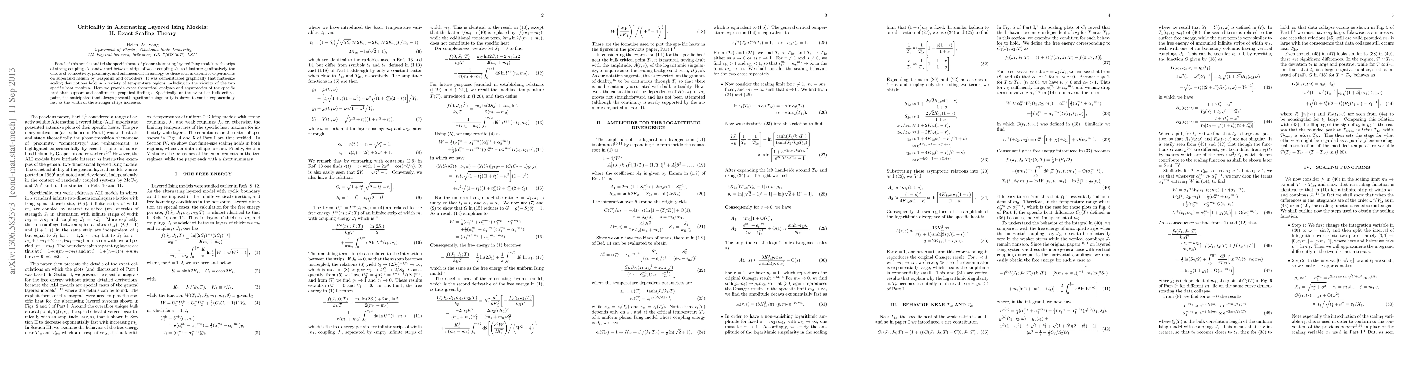 Part I of this article studied the specific heats of planar alternating layered Ising models with strips of strong coupling $J_1$ sandwiched between strips of weak coupling $J_2$, to illustrate qualitatively the effects of connectivity, proximity, and enhancement in analogy to those seen in extensive experiments on superfluid helium by Gasparini and coworkers. It was demonstrated graphically that finite-size scaling descriptions hold in a variety of temperature regions including in the vicinity of the two specific heat maxima. Here we provide exact theoretical analyses and asymptotics of the specific heat that support and confirm the graphical findings. Specifically, at the overall or bulk critical point, the anticipated (and always present) logarithmic singularity is shown to vanish exponentially fast as the width of the stronger strips increases.