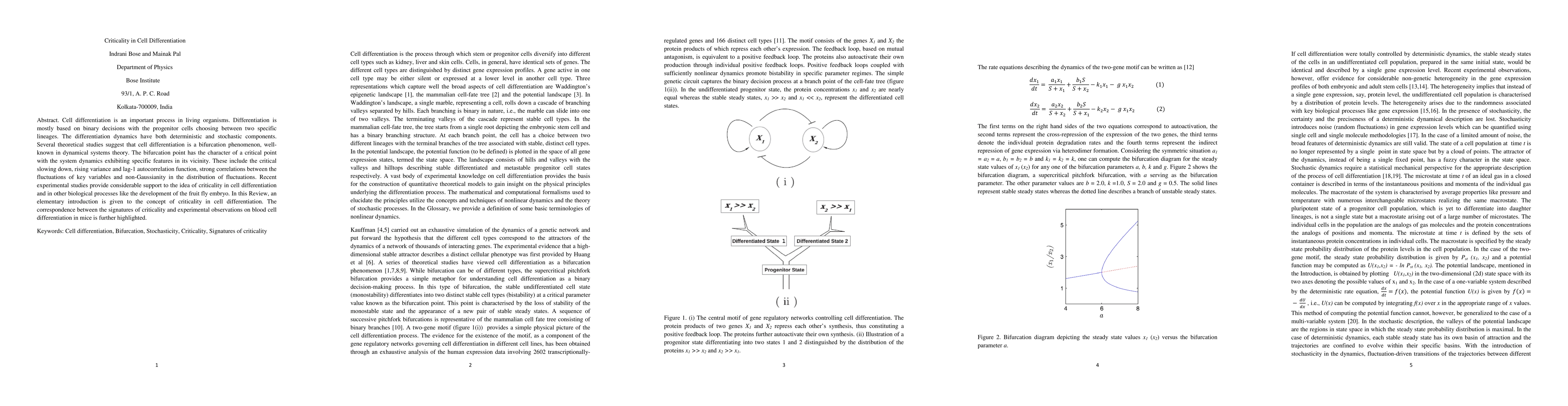 This paper reviews the concept of criticality in cell differentiation, highlighting how differentiation dynamics exhibit bifurcation phenomena akin to those in dynamical systems theory. Experimental evidence supports the idea of criticality in biological processes, with specific signatures observed in blood cell differentiation in mice, such as critical slowing down and non-Gaussianity.
