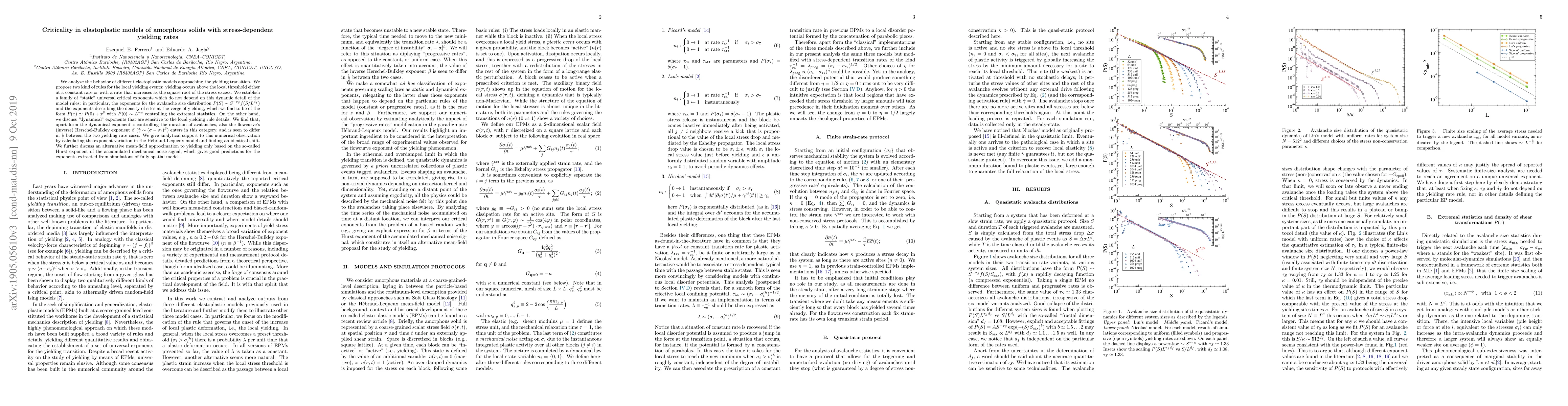 We analyze the behavior of different elastoplastic models approaching the yielding transition. We propose two kind of rules for the local yielding events: yielding occurs above the local threshold either at a constant rate or with a rate that increases as the square root of the stress excess. We establish a family of "static" universal critical exponents which do not depend on this dynamic detail of the model rules: in particular, the exponents for the avalanche size distribution $P(S)\sim S^{-\tau_S}f(S/L^{d_f})$ and the exponents describing the density of sites at the verge of yielding, which we find to be of the form $P(x)\simeq P(0) + x^\theta$ with $P(0)\sim L^{-a}$ controlling the extremal statistics. On the other hand, we discuss "dynamical" exponents that are sensitive to the local yielding rule details. We find that, apart form the dynamical exponent $z$ controlling the duration of avalanches, also the flowcurve's (inverse) Herschel-Bulkley exponent $\beta$ ($\dot\gamma\sim(\sigma-\sigma_c)^\beta$) enters in this category, and is seen to differ in $\frac12$ between the two yielding rate cases. We give analytical support to this numerical observation by calculating the exponent variation in the H\'ebraud-Lequeux model and finding an identical shift. We further discuss an alternative mean-field approximation to yielding only based on the so-called Hurst exponent of the accumulated mechanical noise signal, which gives good predictions for the exponents extracted from simulations of fully spatial models.