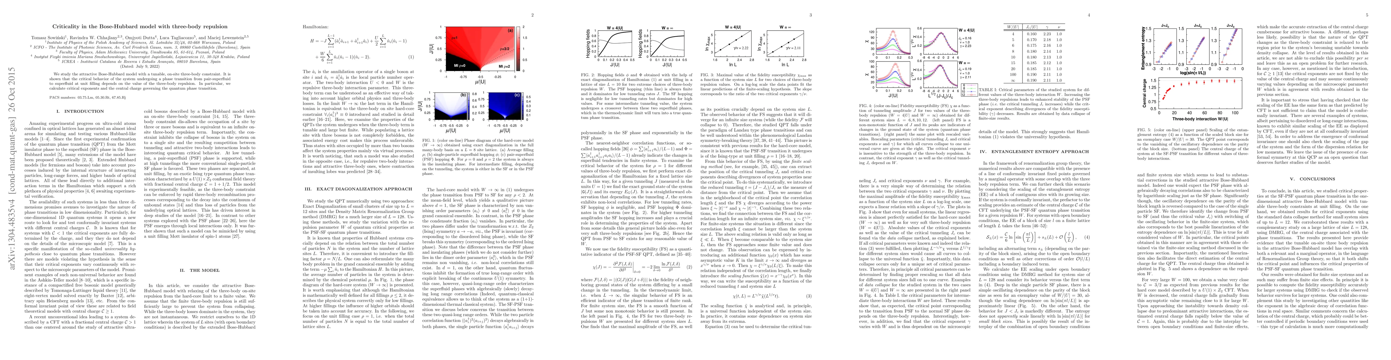 We study the attractive Bose-Hubbard model with a tunable, on-site three-body constraint. It is shown that the critical behavior of the system undergoing a phase transition from pair-superfluid to superfluid at unit filling depends on the value of the three-body repulsion. In particular, we calculate critical exponents and the central charge governing the quantum phase transition.