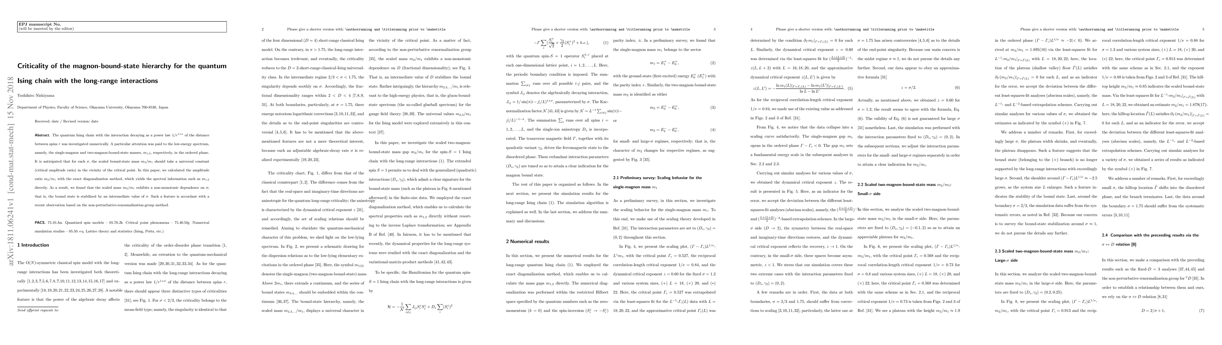 This paper investigates the quantum Ising chain with long-range interactions, focusing on the low-energy spectrum and the ratio of single-magnon and two-magnon-bound-state masses. The study reveals a non-monotonic dependence of the scaled mass ratio on the interaction decay parameter, indicating stabilization by an intermediate value of the decay parameter.