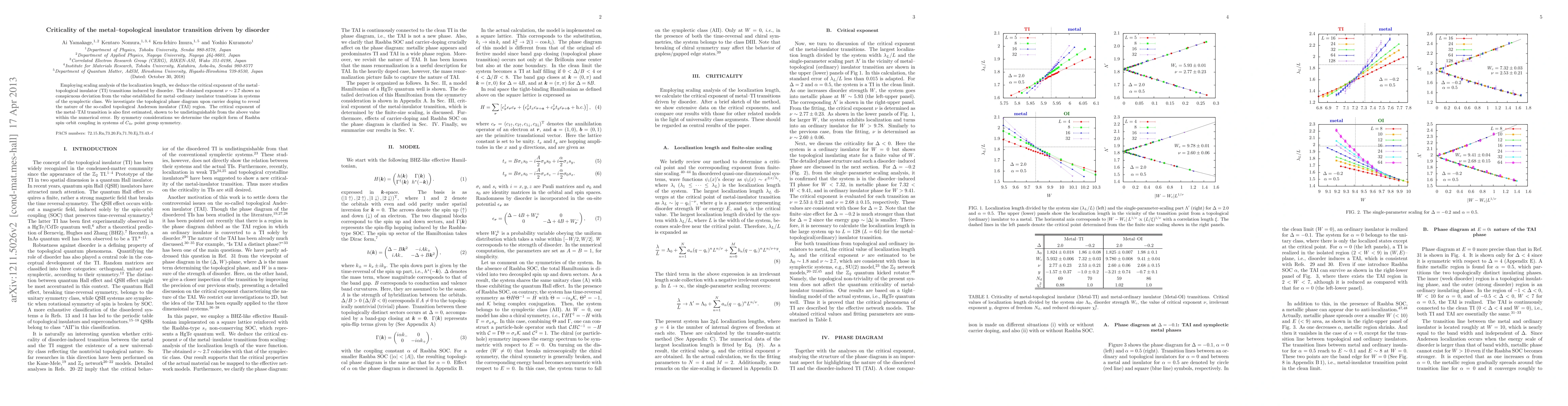 Employing scaling analysis of the localization length, we deduce the critical exponent of the metal-topological insulator (TI) transitions induced by disorder. The obtained exponent nu~2.7 shows no conspicuous deviation from the value established for metal-ordinary insulator transitions in systems of the symplectic class. We investigate the topological phase diagram upon carrier doping to reveal the nature of the so-called topological Anderson insulator (TAI) region. The critical exponent of the metal-TAI transition is also first estimated, shown to be undistinguishable from the above value within the numerical error. By symmetry considerations we determine the explicit form of Rashba spin-orbit coupling in systems of C4v point group symmetry.