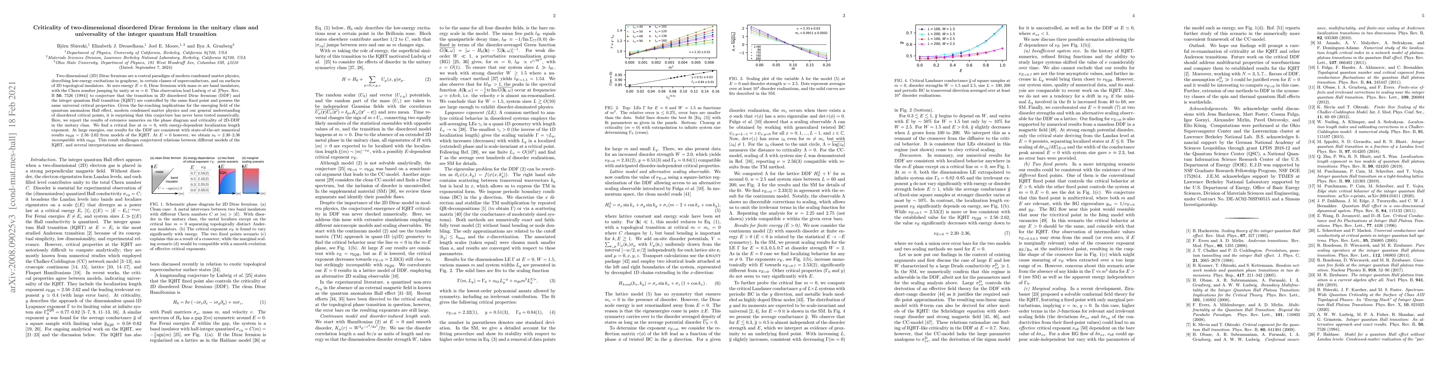 This paper investigates the criticality of two-dimensional disordered Dirac fermions in the unitary class and finds a critical line at zero energy with an energy-dependent localization length exponent. The study reveals discrepancies between the critical properties of these fermions and those of the integer quantum Hall transition, challenging existing conjectures.
