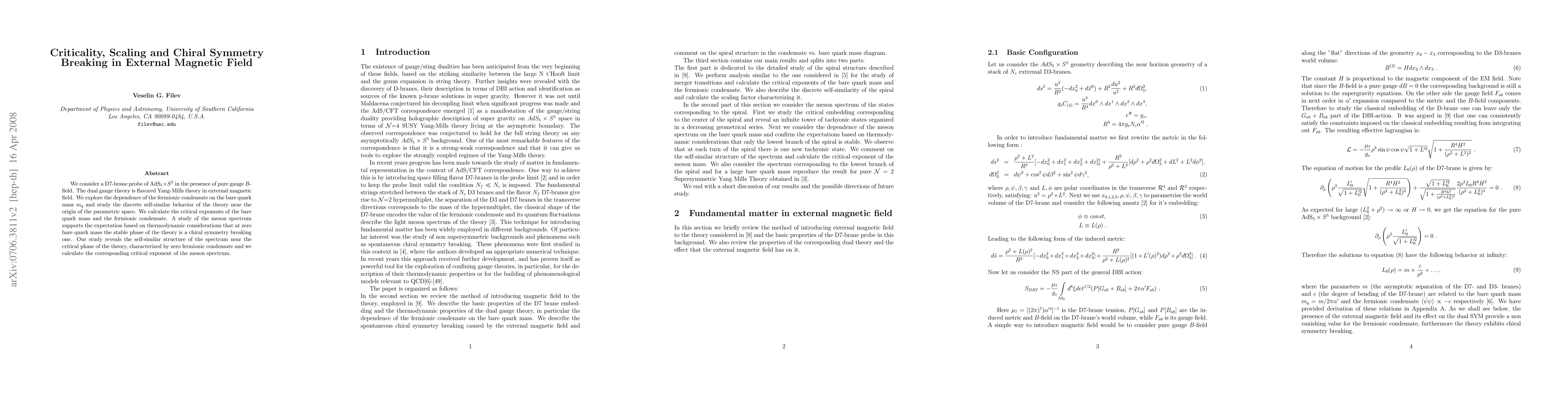 We consider a D7-brane probe of $AdS_{5}\times S^5$ in the presence of pure gauge $B$-field. The dual gauge theory is flavored Yang-Mills theory in external magnetic field. We explore the dependence of the fermionic condensate on the bare quark mass $m_{q}$ and study the discrete self-similar behavior of the theory near the origin of the parametric space. We calculate the critical exponents of the bare quark mass and the fermionic condensate. A study of the meson spectrum supports the expectation based on thermodynamic considerations that at zero bare quark mass the stable phase of the theory is a chiral symmetry breaking one. Our study reveals the self-similar structure of the spectrum near the critical phase of the theory, characterized by zero fermionic condensate and we calculate the corresponding critical exponent of the meson spectrum.