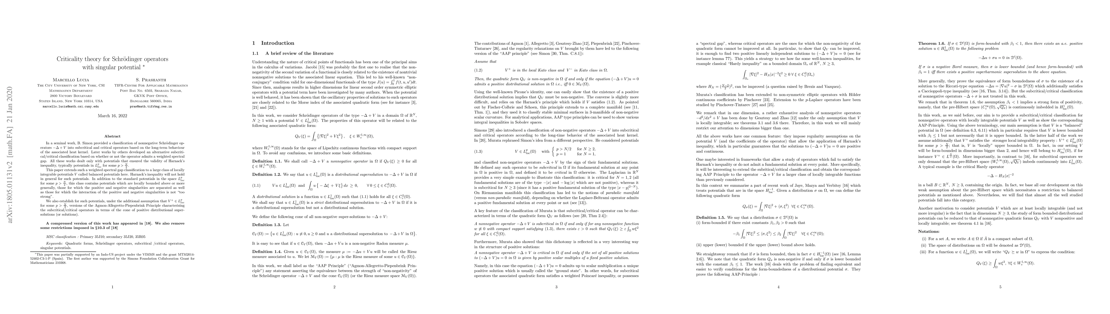 This paper extends the classification of Schrödinger operators into subcritical and critical types to a broader class of singular potentials, termed balanced potentials, which do not necessarily satisfy Harnack's inequality. It establishes versions of the Agmon-Allegretto-Piepenbrink Principle for these potentials under certain local integrability conditions.