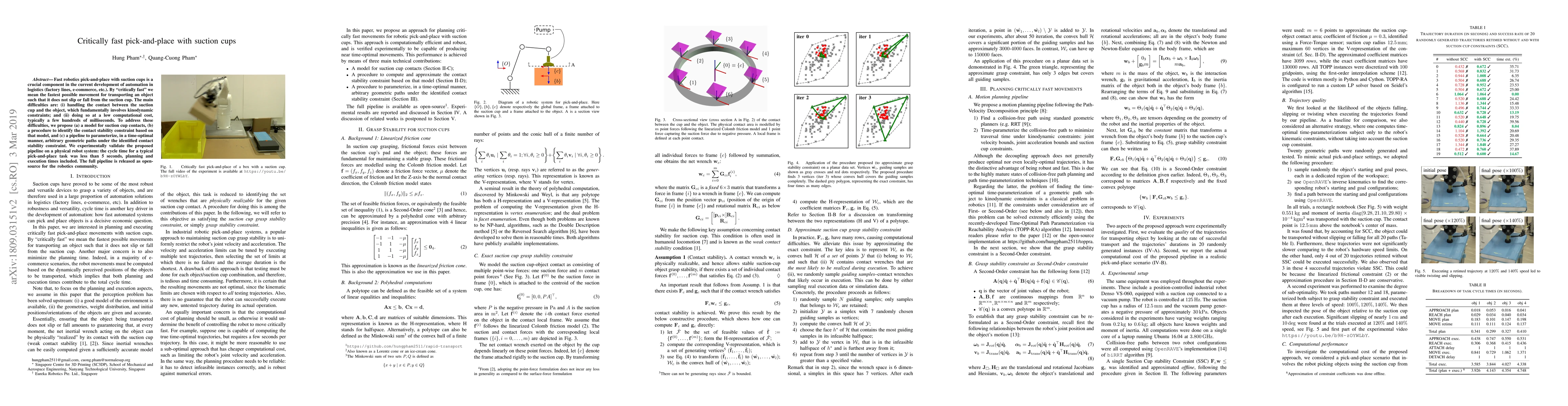 Fast robotics pick-and-place with suction cups is a crucial component in the current development of automation in logistics (factory lines, e-commerce, etc.). By "critically fast" we mean the fastest possible movement for transporting an object such that it does not slip or fall from the suction cup. The main difficulties are: (i) handling the contact between the suction cup and the object, which fundamentally involves kinodynamic constraints; and (ii) doing so at a low computational cost, typically a few hundreds of milliseconds. To address these difficulties, we propose (a) a model for suction cup contacts, (b) a procedure to identify the contact stability constraint based on that model, and (c) a pipeline to parameterize, in a time-optimal manner, arbitrary geometric paths under the identified contact stability constraint. We experimentally validate the proposed pipeline on a physical robot system: the cycle time for a typical pick-and-place task was less than 5 seconds, planning and execution times included. The full pipeline is released as open-source for the robotics community.