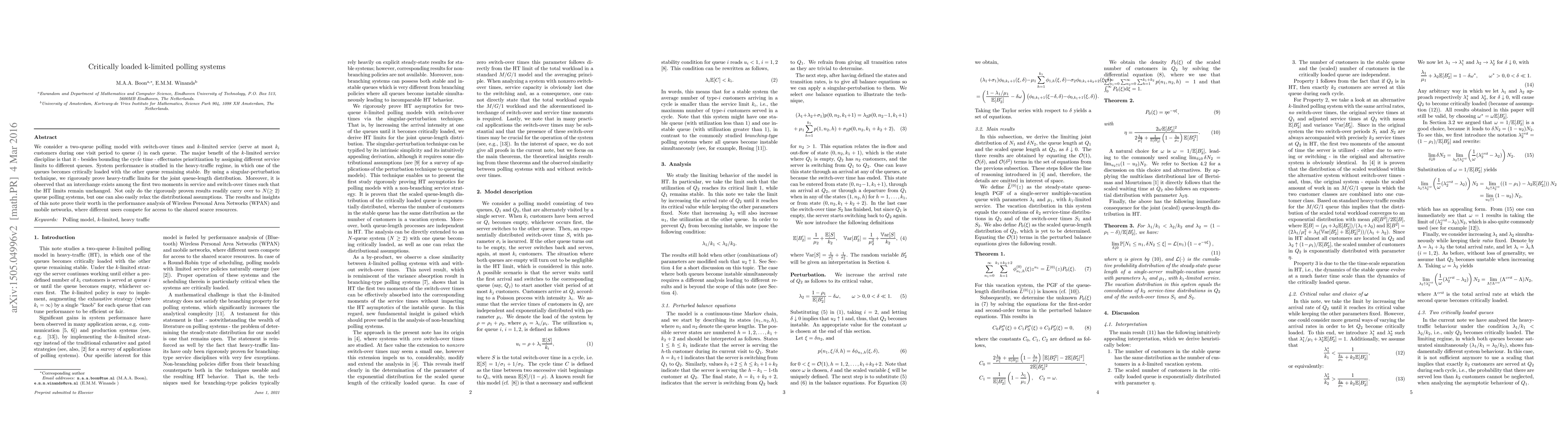 This paper studies a two-queue polling system with switch-over times and $k$-limited service, proving heavy-traffic limits for the joint queue-length distribution using singular-perturbation techniques. The results show that the system's performance remains stable under interchanges in service and switch-over times, and are applicable to multi-queue systems and various distributional assumptions, with implications for WPAN and mobile network performance analysis.