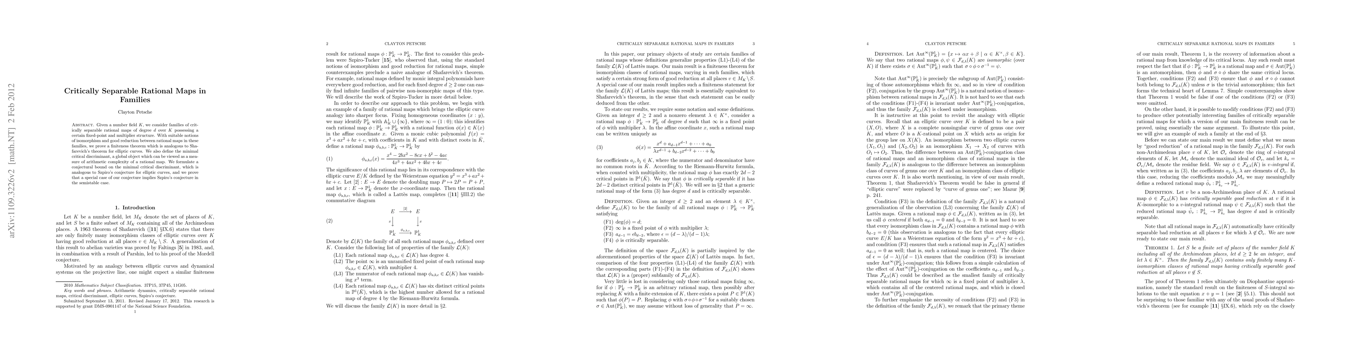 Given a number field K, we consider families of critically separable rational maps of degree d over K possessing a certain fixed-point and multiplier structure. With suitable notions of isomorphism and good reduction between rational maps in these families, we prove a finiteness theorem which is analogous to Shafarevich's theorem for elliptic curves. We also define the minimal critical discriminant, a global object which can be viewed as a measure of arithmetic complexity of a rational map. We formulate a conjectural bound on the minimal critical discriminant, which is analogous to Szpiro's conjecture for elliptic curves, and we prove that a special case of our conjecture implies Szpiro's conjecture in the semistable case.