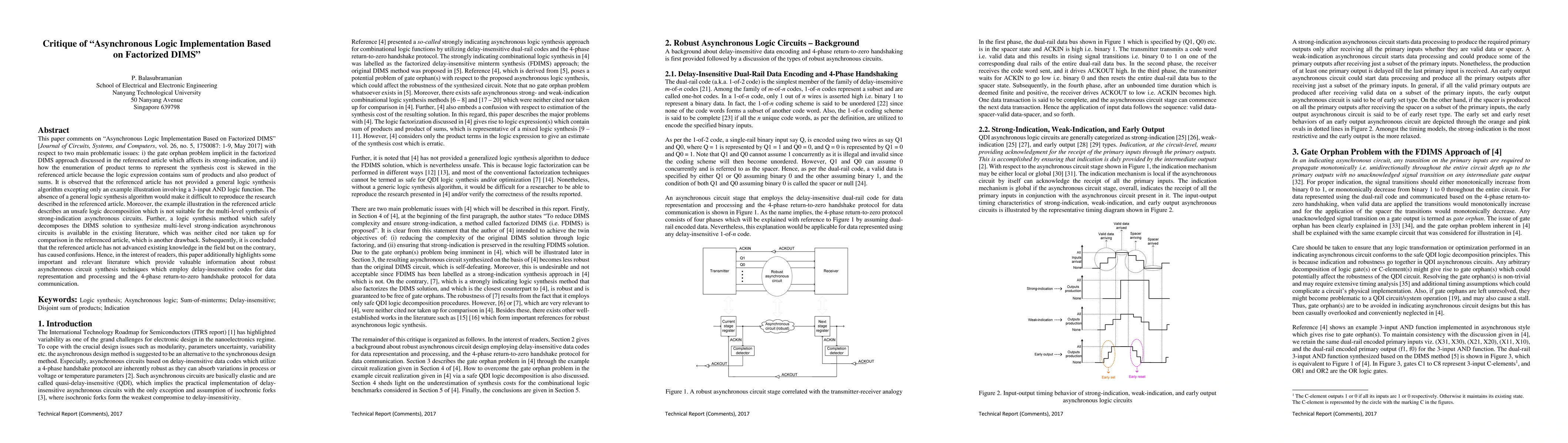 This paper comments on "Asynchronous Logic Implementation Based on Factorized DIMS" [Journal of Circuits, Systems, and Computers, vol. 26, no. 5, 1750087: 1-9, May 2017] with respect to two main problematic issues: i) the gate orphan problem implicit in the factorized DIMS approach discussed in the referenced article which affects its strong-indication, and ii) how the enumeration of product terms to represent the synthesis cost is skewed in the referenced article because the logic expression contains sum of products and also product of sums. It is observed that the referenced article has not provided a general logic synthesis algorithm excepting only an example illustration involving a 3-input AND logic function. The absence of a general logic synthesis algorithm would make it difficult to reproduce the research described in the referenced article. Moreover, the example illustration in the referenced article describes an unsafe logic decomposition which is not suitable for the multi-level synthesis of strong-indication asynchronous circuits. Further, a logic synthesis method which safely decomposes the DIMS solution to synthesize multi-level strong-indication asynchronous circuits is available in the existing literature, which was neither cited nor taken up for comparison in the referenced article, which is another drawback. Subsequently, it is concluded that the referenced article has not advanced existing knowledge in the field but on the contrary, has caused confusions. Hence, in the interest of readers, this paper additionally highlights some important and relevant literature which provide valuable information about robust asynchronous circuit synthesis techniques which employ delay-insensitive codes for data representation and processing and the 4-phase return-to-zero handshake protocol for data communication.