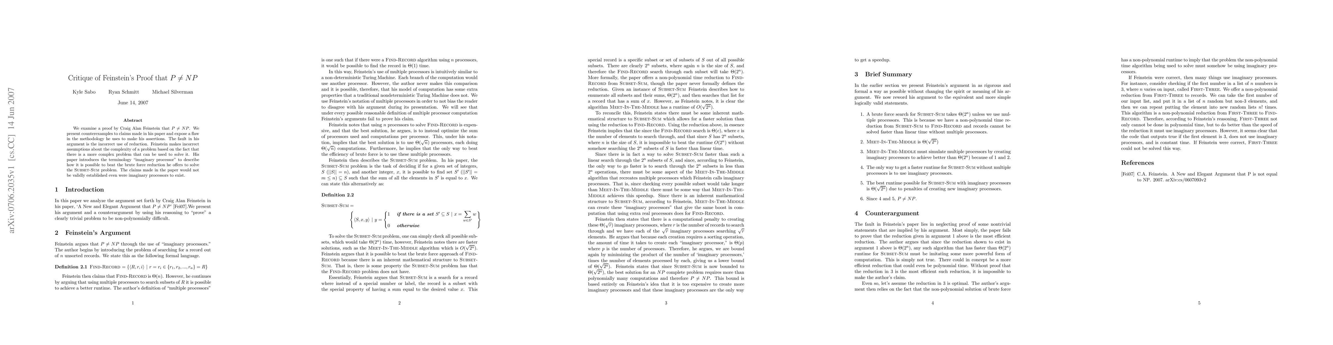 We examine a proof by Craig Alan Feinstein that P is not equal to NP. We present counterexamples to claims made in his paper and expose a flaw in the methodology he uses to make his assertions. The fault in his argument is the incorrect use of reduction. Feinstein makes incorrect assumptions about the complexity of a problem based on the fact that there is a more complex problem that can be used to solve it. His paper introduces the terminology "imaginary processor" to describe how it is possible to beat the brute force reduction he offers to solve the Subset-Sum problem. The claims made in the paper would not be validly established even were imaginary processors to exist.