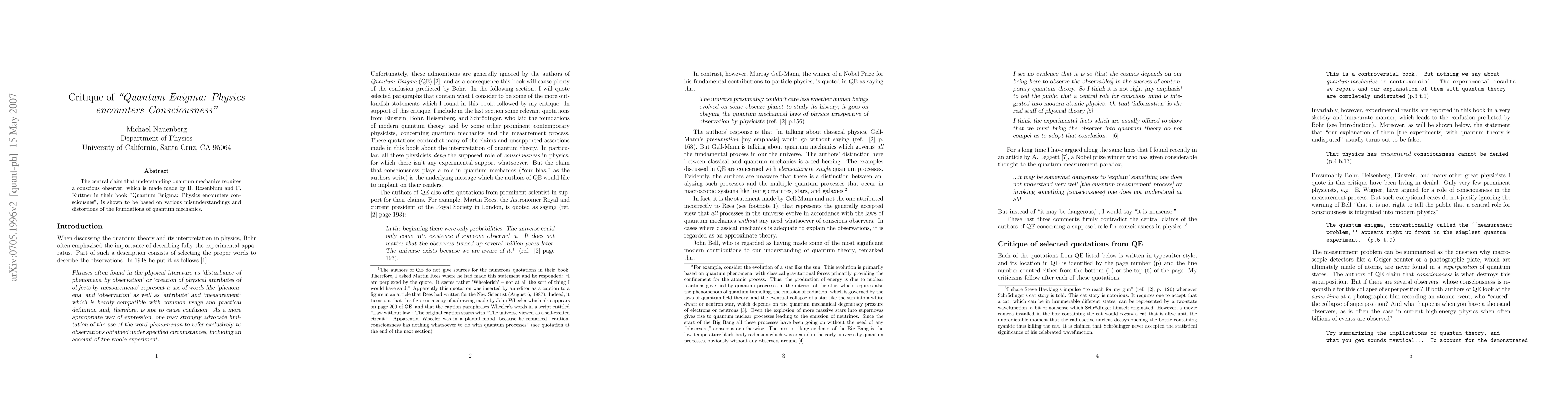 Summary: This critique demonstrates that the assertion in "Quantum Enigma: Physics encounters Consciousness" by B. Rosenblum and F. Kuttner that quantum mechanics necessitates a conscious observer is flawed, rooted in misinterpretations of quantum mechanics' foundational principles.