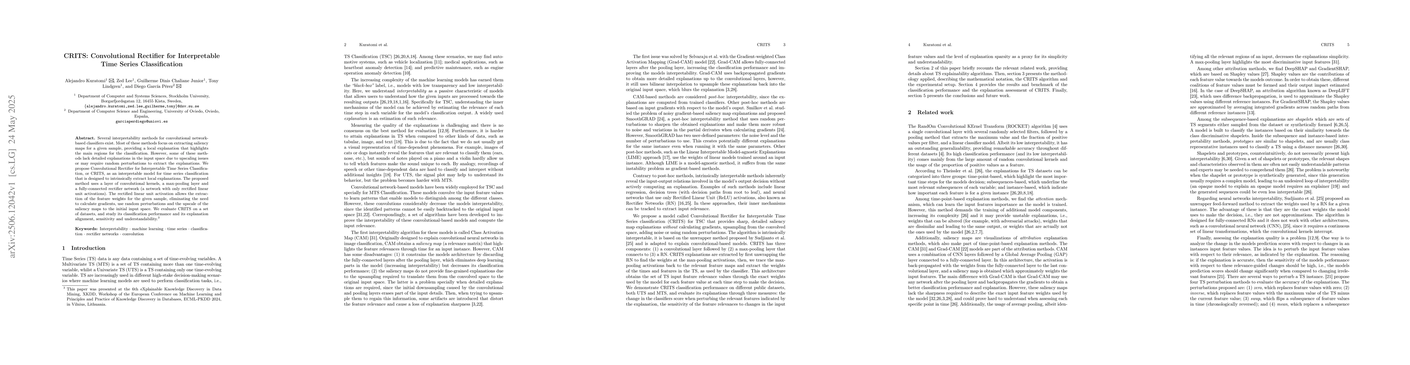 Several interpretability methods for convolutional network-based classifiers exist. Most of these methods focus on extracting saliency maps for a given sample, providing a local explanation that highlights the main regions for the classification. However, some of these methods lack detailed explanations in the input space due to upscaling issues or may require random perturbations to extract the explanations. We propose Convolutional Rectifier for Interpretable Time Series Classification, or CRITS, as an interpretable model for time series classification that is designed to intrinsically extract local explanations. The proposed method uses a layer of convolutional kernels, a max-pooling layer and a fully-connected rectifier network (a network with only rectified linear unit activations). The rectified linear unit activation allows the extraction of the feature weights for the given sample, eliminating the need to calculate gradients, use random perturbations and the upscale of the saliency maps to the initial input space. We evaluate CRITS on a set of datasets, and study its classification performance and its explanation alignment, sensitivity and understandability.